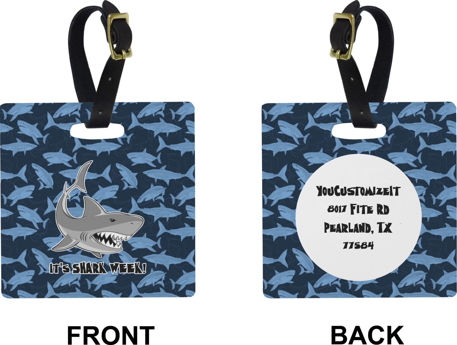 These personalized bag tags are sold in a variety of shapes, so that you may find the product that meets your vision exactly. We sell a round luggage tag, which measures at approximately 4" x 4". Our square luggage tag is about 3.5" x 3.5", while our rectangular version is 2.75" x 4 ".
