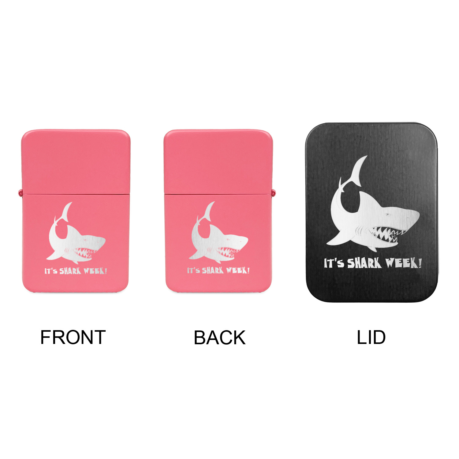 Available in black or pink powdercoat, we then laser engrave on the front and back (optional) with your design. Additionally you also have the option of engraving the lid to the included black tin case if so desired.