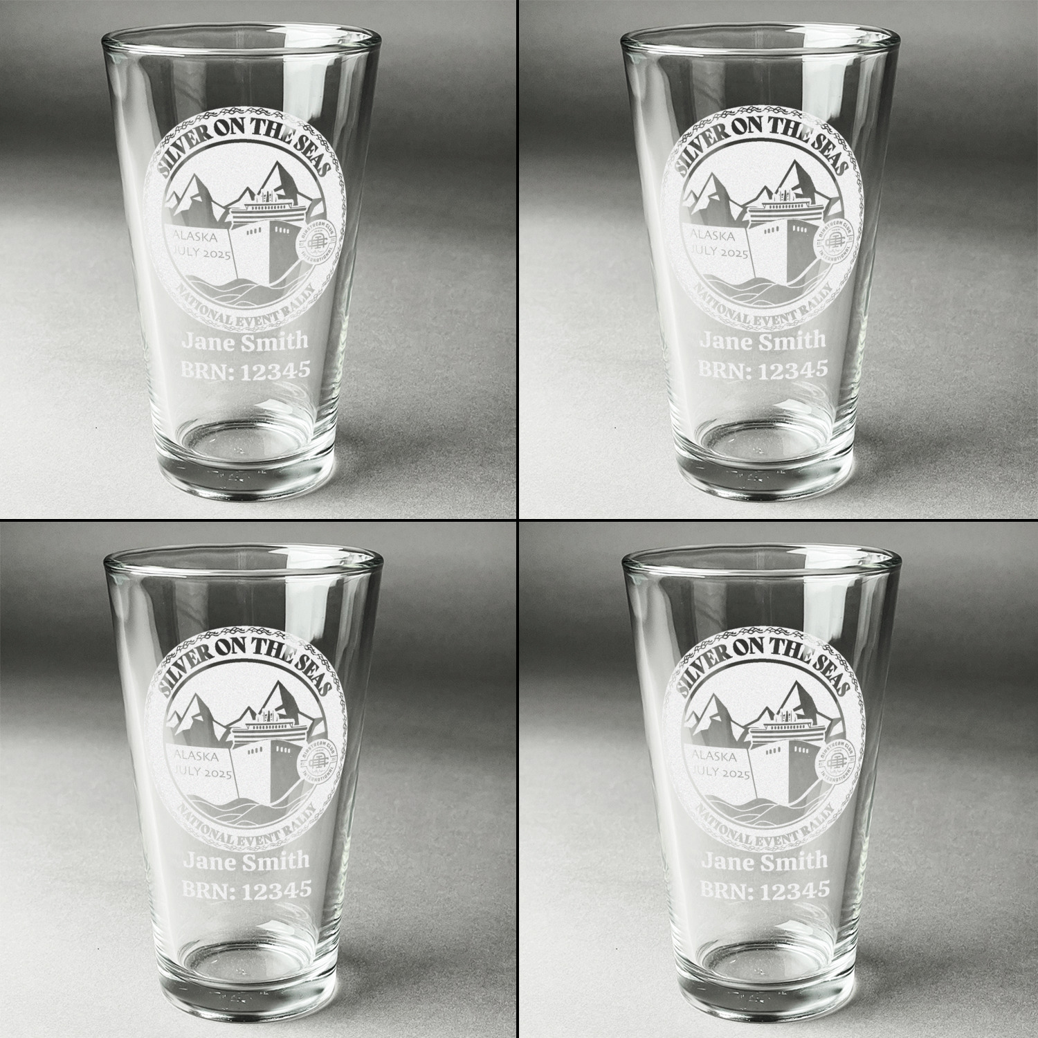 Available in a single glass or a set of 4 - each glass will be custom engraved with your design. Each glass holds 16 oz and measure 5.75"H x 3.5"W.