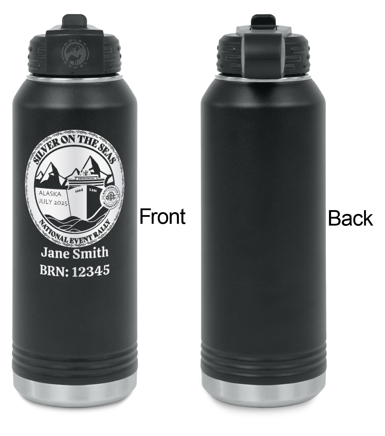 These 32 oz. water bottles are constructed from 18/8 durable food grade stainless steel. The inside of the water bottle is silver; while the outside is powder coated black