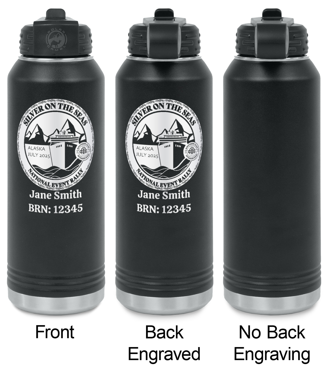 Your design is laser engraved on the water bottles. The engraving removes the black powder coating in the designed area to expose the silver stainless steel underneath.
