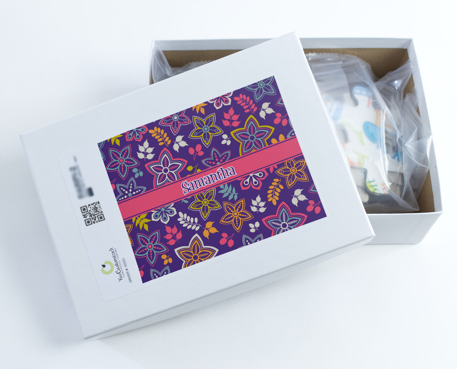 The flowers in this design are are a vibrant mix of fall colors, all on a deep plum background. The design has a classic ribbon in hot pink, the perfect place to add a name for that personal touch to pull the entire design together.