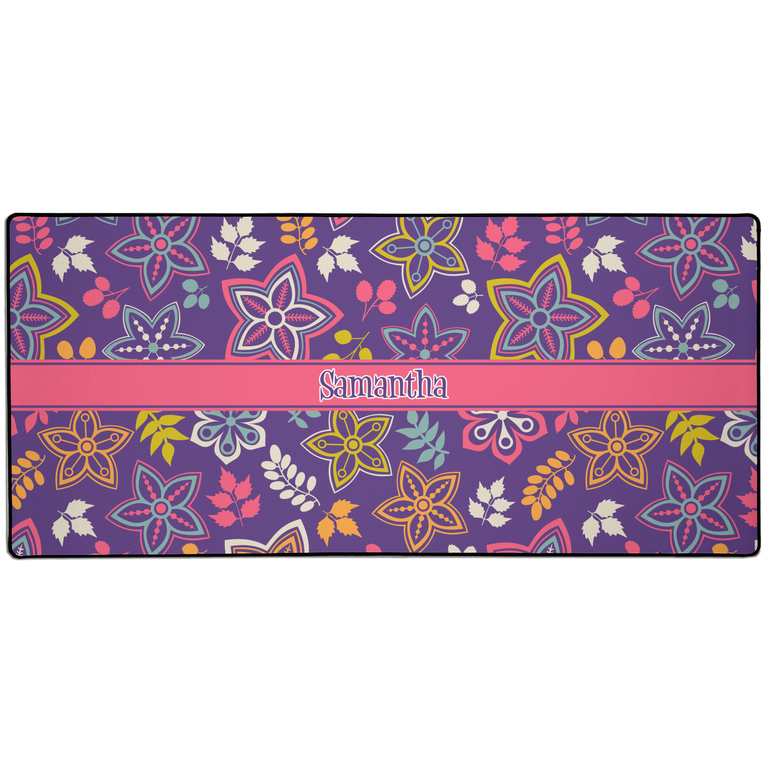 The flowers in this design are are a vibrant mix of fall colors, all on a deep plum background. The design has a classic ribbon in hot pink, the perfect place to add a name for that personal touch to pull the entire design together.