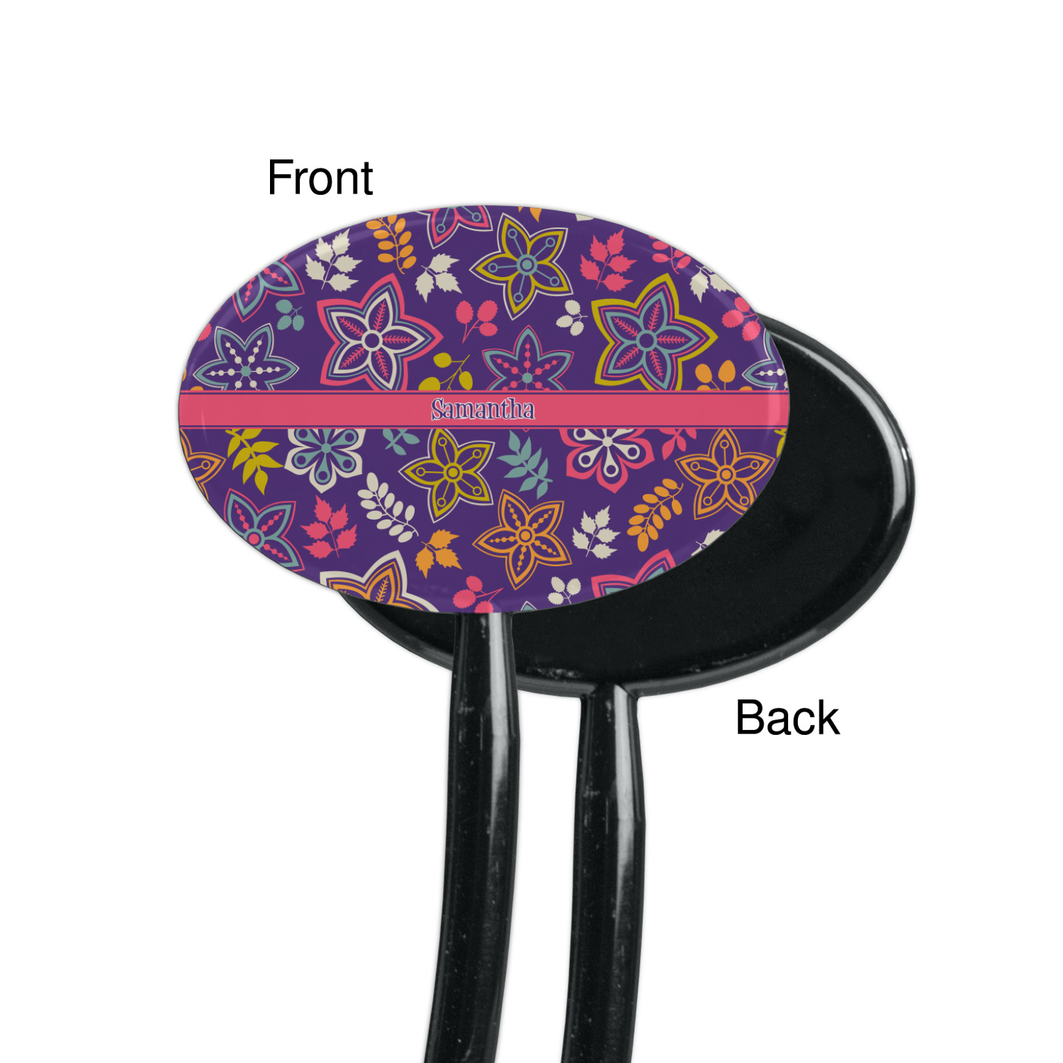 The flowers in this design are are a vibrant mix of fall colors, all on a deep plum background. The design has a classic ribbon in hot pink, the perfect place to add a name for that personal touch to pull the entire design together.