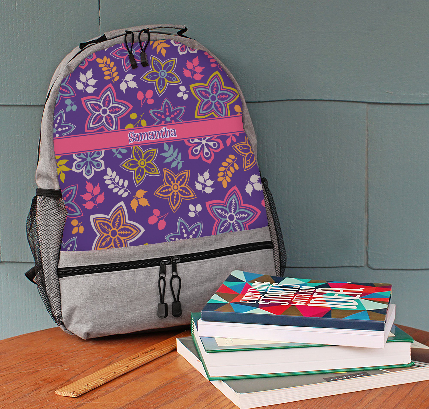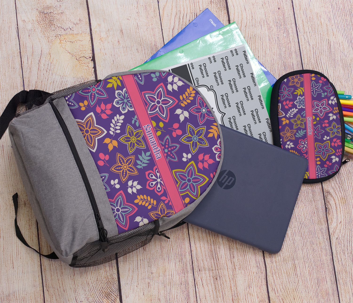 The flowers in this design are are a vibrant mix of fall colors, all on a deep plum background. The design has a classic ribbon in hot pink, the perfect place to add a name for that personal touch to pull the entire design together.