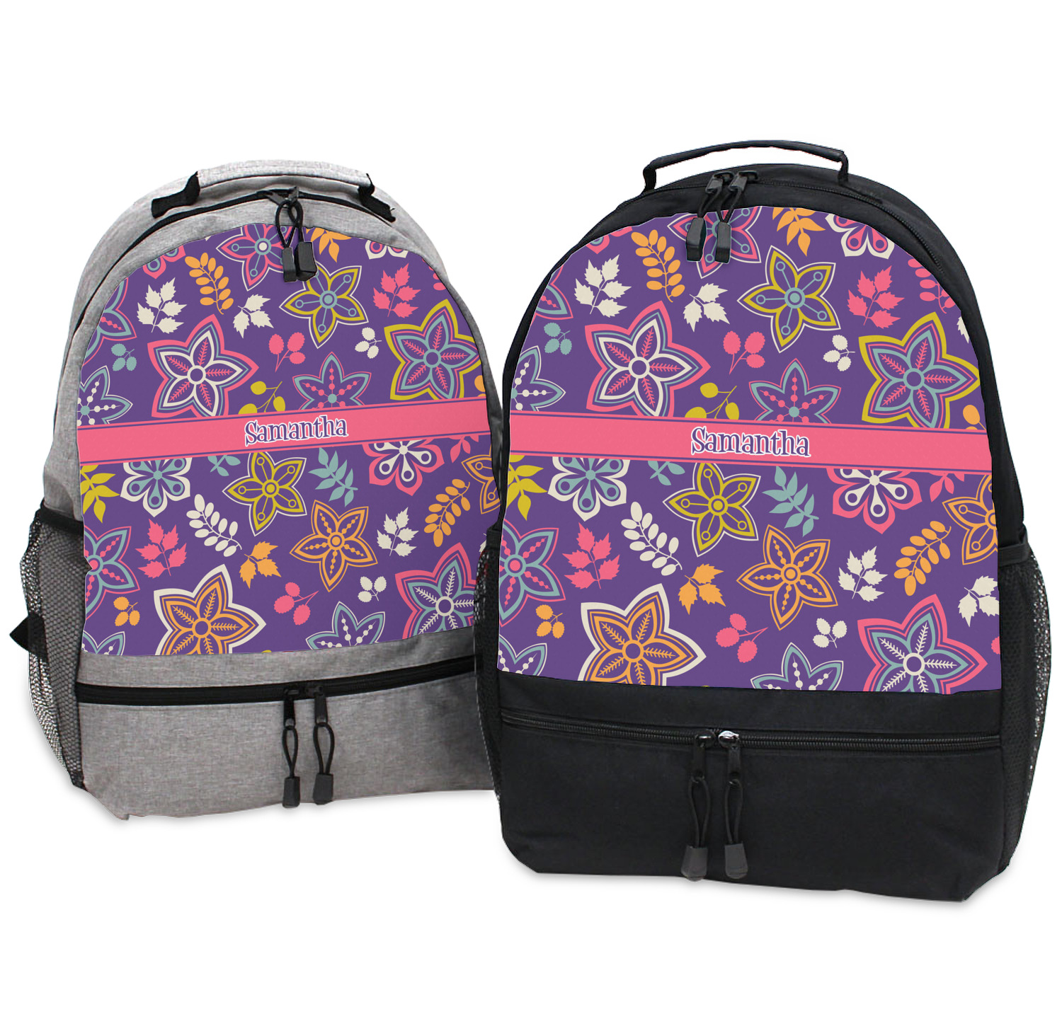 The flowers in this design are are a vibrant mix of fall colors, all on a deep plum background. The design has a classic ribbon in hot pink, the perfect place to add a name for that personal touch to pull the entire design together.