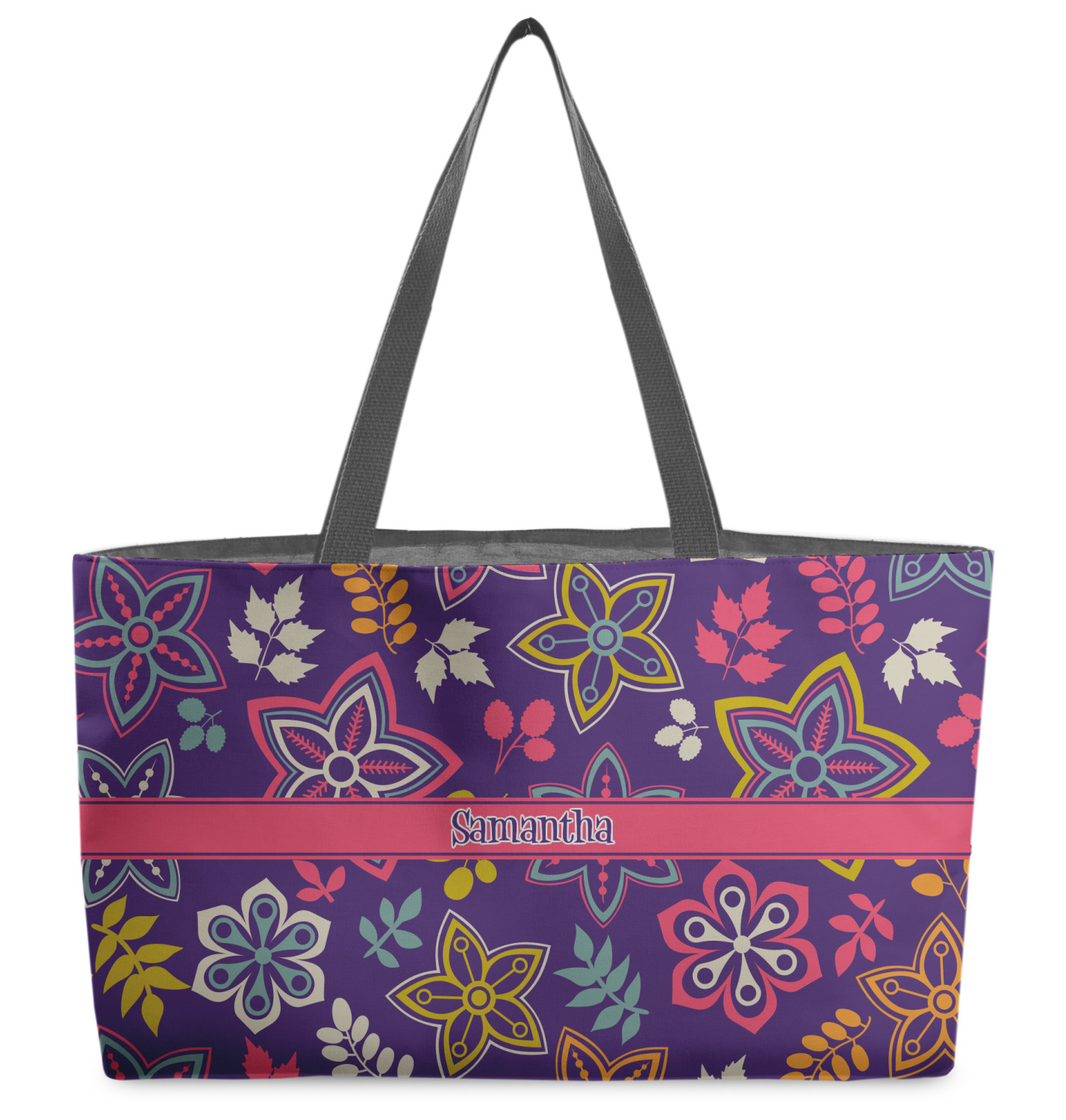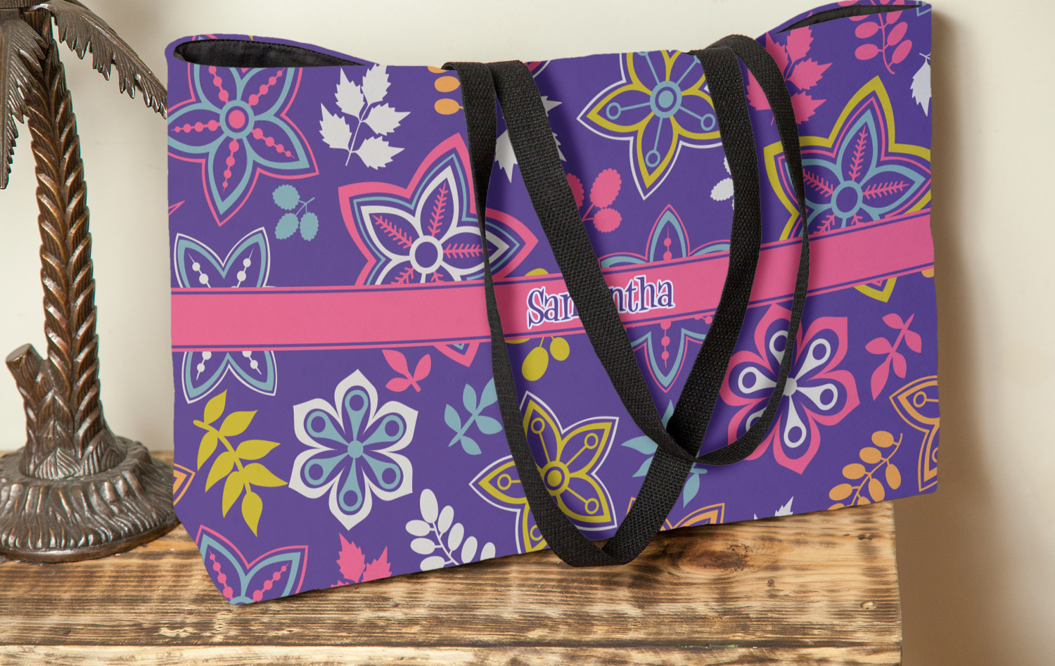 These beach totes are handmade here in the USA. Fabric is printed with your design. The tote is then sewn from the fabric pieces, lining and handles added.