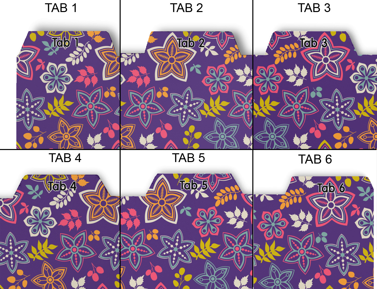 Whether you use binders at school or at work, we have designs to suit all of them. Available in 5 or 6 tab sets, you are sure to find a set to suit your needs. The back of each one is white and can be used to take notes, write vital information on, etc.