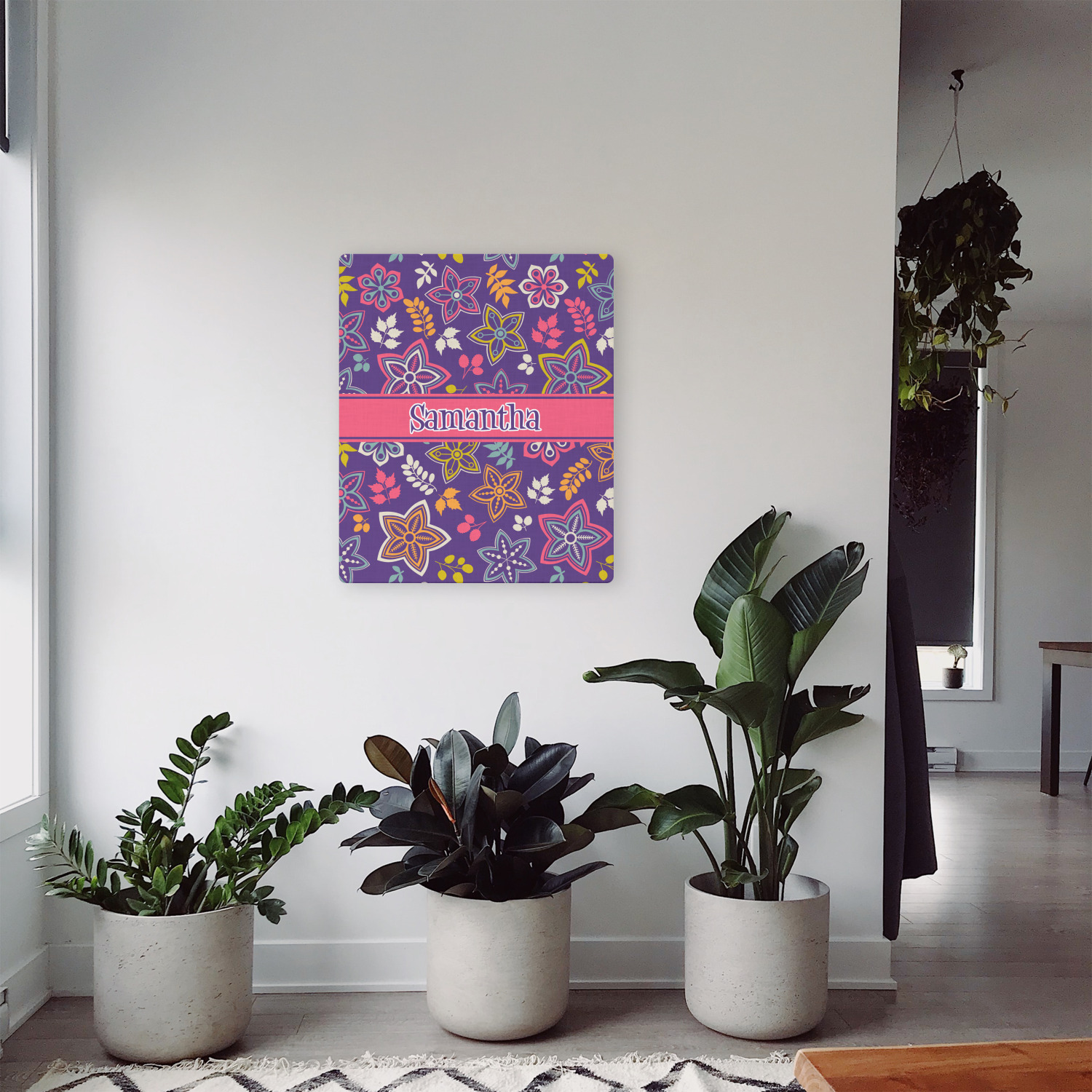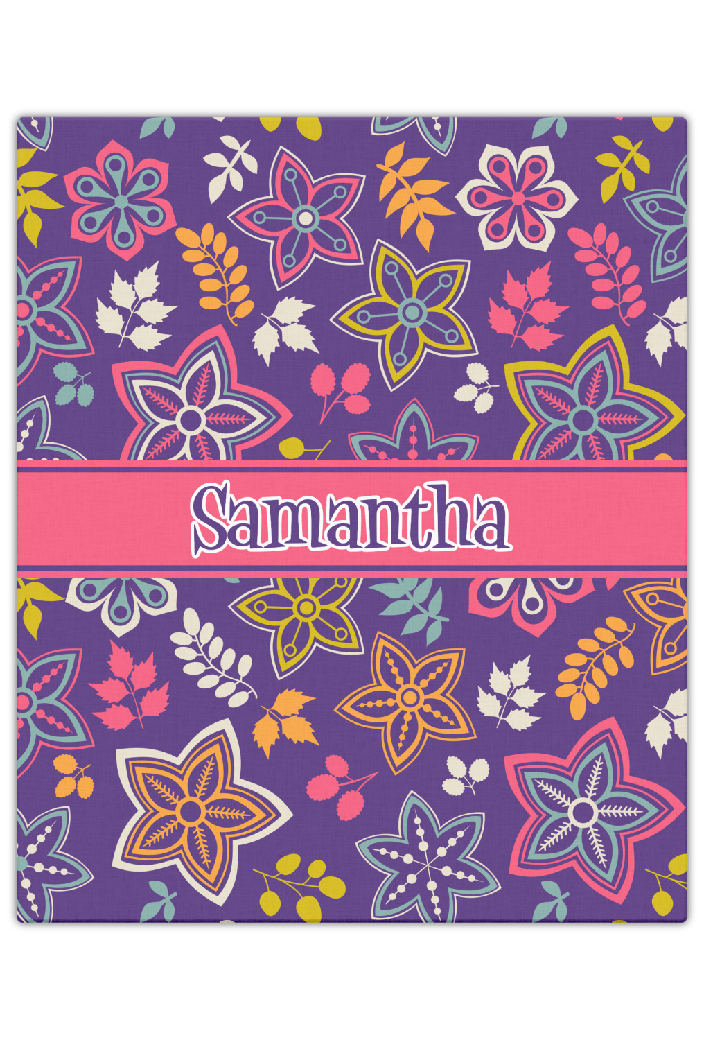 The flowers in this design are are a vibrant mix of fall colors, all on a deep plum background. The design has a classic ribbon in hot pink, the perfect place to add a name for that personal touch to pull the entire design together.