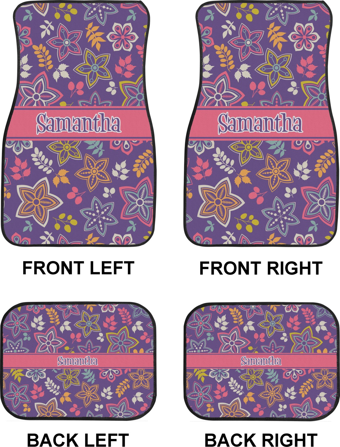 We craft our auto floor mats mats from polyester, apply a black finish to the edges, and lined at the bottom to prevent slippage. These mats protect your floors from grass, mud, and any accidental spills. We display your personalized design on the front face of each mat. The sizes of these car floor liners are standardized to provide a versatile fit for all vehicles. The front rows car mats measure at 17 by 26.5 inches, while the back rows measure at 17 by 13 inches. We sell three packages of car floor mats. You can purchase a pair of front row car mats, a pair of back row car mats, or a set of front row and back row car mats. To make an informed purchase, we recommend measuring the surface area of your car floors.