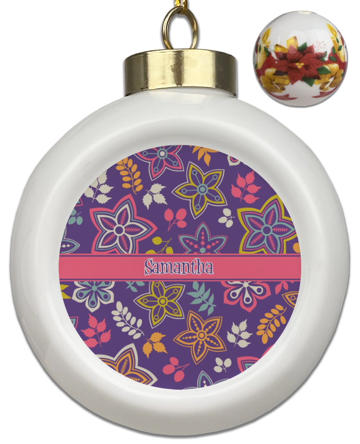 Our Christmas ornaments are a unique ceramic ball shape with a twist as it has a flat face to display your custom design! Select from one of our two design types - Christmas Tree or Poinsettia Garland - to adorn the curved back of your personal design. Each ornament measures 3H x 2.5W x 2D accompanied with a gold string accent for finishing touches to hang on your beautiful Christmas tree!