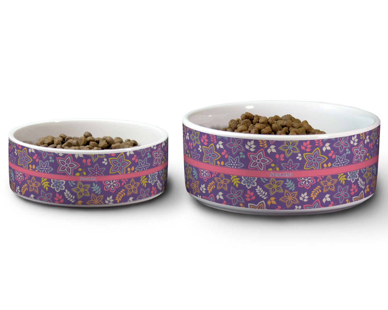 We carry these custom dog bowls in two available sizes: medium and large.The medium is 6 inches in diameter and 2.5 inches tall, and can therefore suit pets who eat up to 2.5 cups of food per meal. The large pet bowl is 7 inches in diameter and 3 inches tall, and suits pets who require up to 4.5 cups of food per meal.