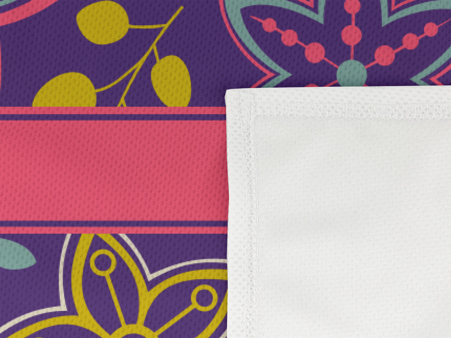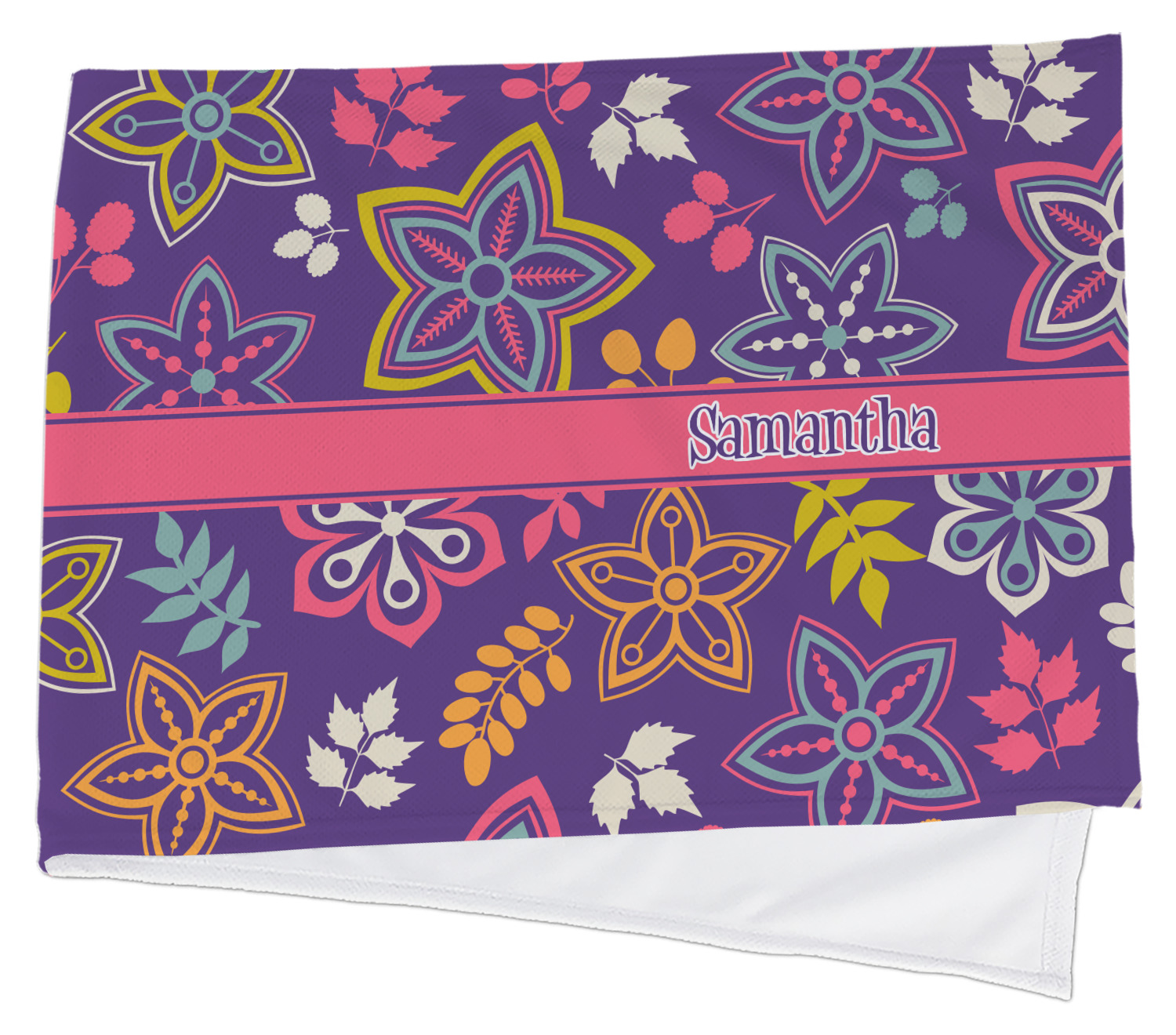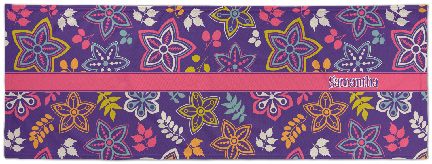The flowers in this design are are a vibrant mix of fall colors, all on a deep plum background. The design has a classic ribbon in hot pink, the perfect place to add a name for that personal touch to pull the entire design together.