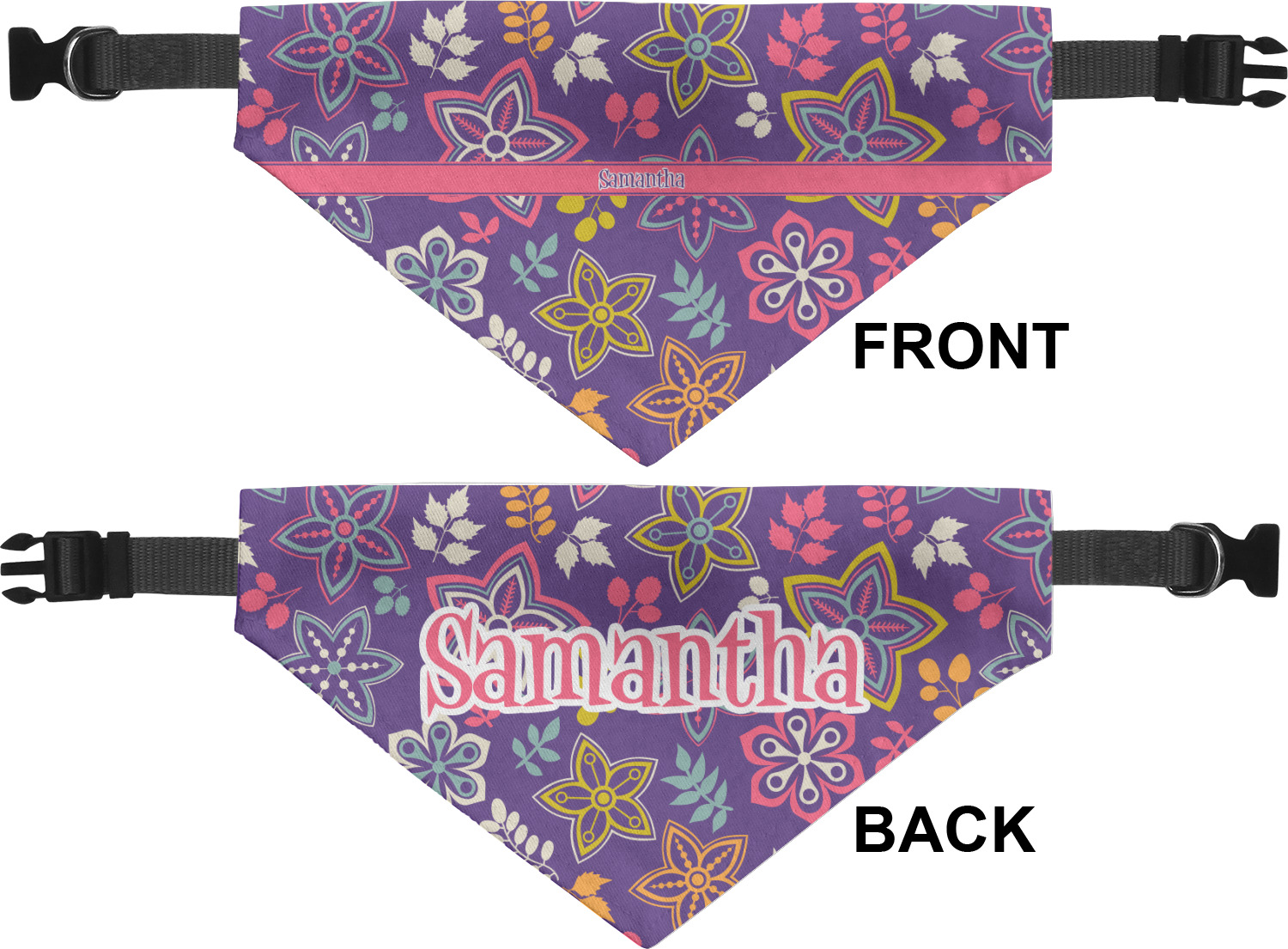 We print the front and back of these dog bandanas with your customized design. The bandana itself is made from a durable polyester, sewn together with a gap large enough to accommodate any collar. Regardless, the bandana includes a plain black, canvas collar with plastic snaps, that can easily be removed if desired. These dog bandana collars are available in four sizes: small, medium, large, and extra large. Please see our sizing chart for more information regarding the dimensions of each size.