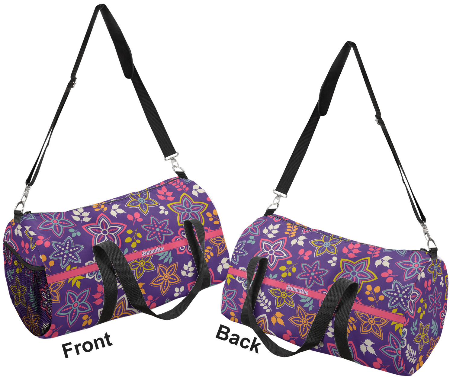 This duffle is a sturdy bag made of a canvas material. It comes in two sizes: Small (19"W x 9.5"H x 9.5"D) and Large (23"W x 12"H x 12"D). The bag is a cylindrical shape with a black adjustable strap and two handles. On one side is an elastic pouch to put a waterbottle or other small item. Your product will be sublimated with your design and is able to be designed on the front, back, and sides. Be sure to remember that the straps may cut into parts of your design if you upload your own artwork.