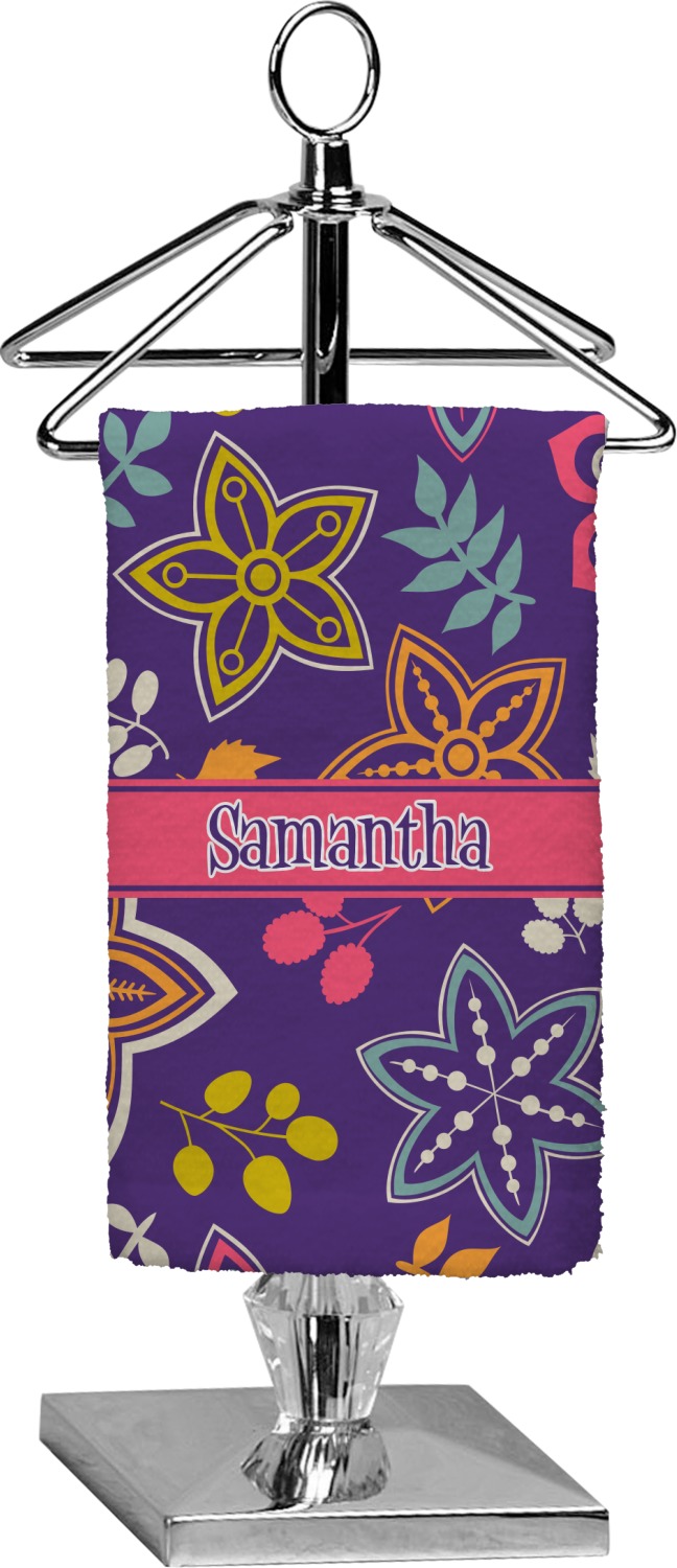 The flowers in this design are are a vibrant mix of fall colors, all on a deep plum background. The design has a classic ribbon in hot pink, the perfect place to add a name for that personal touch to pull the entire design together.