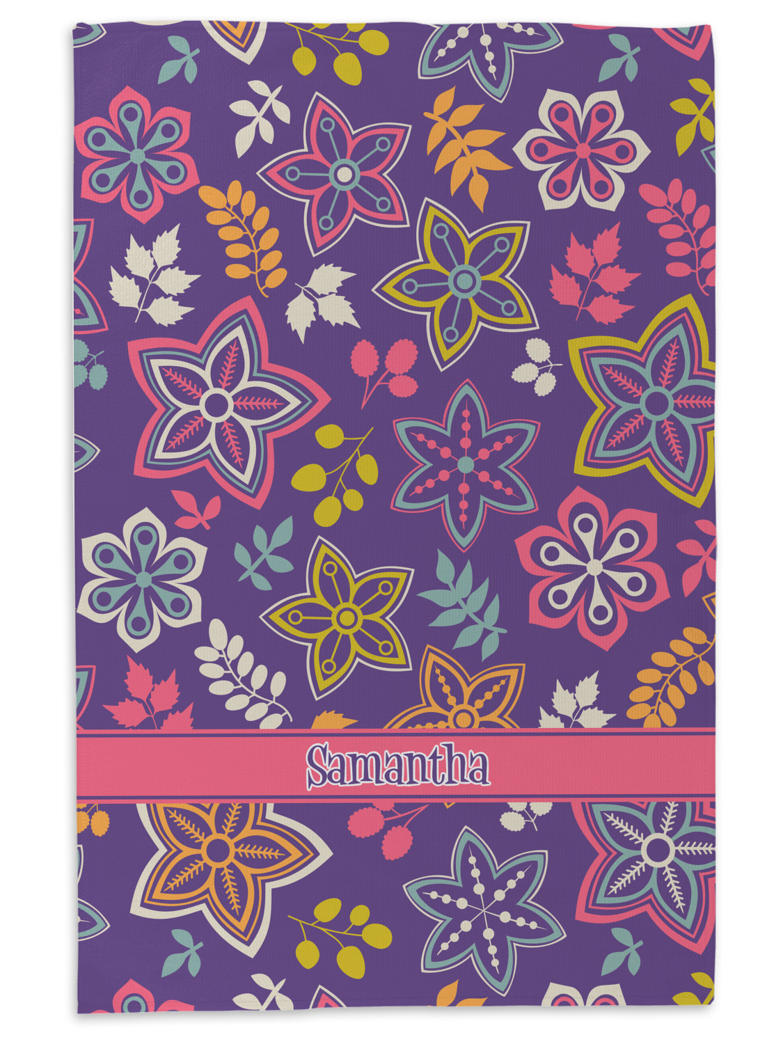 The flowers in this design are are a vibrant mix of fall colors, all on a deep plum background. The design has a classic ribbon in hot pink, the perfect place to add a name for that personal touch to pull the entire design together.