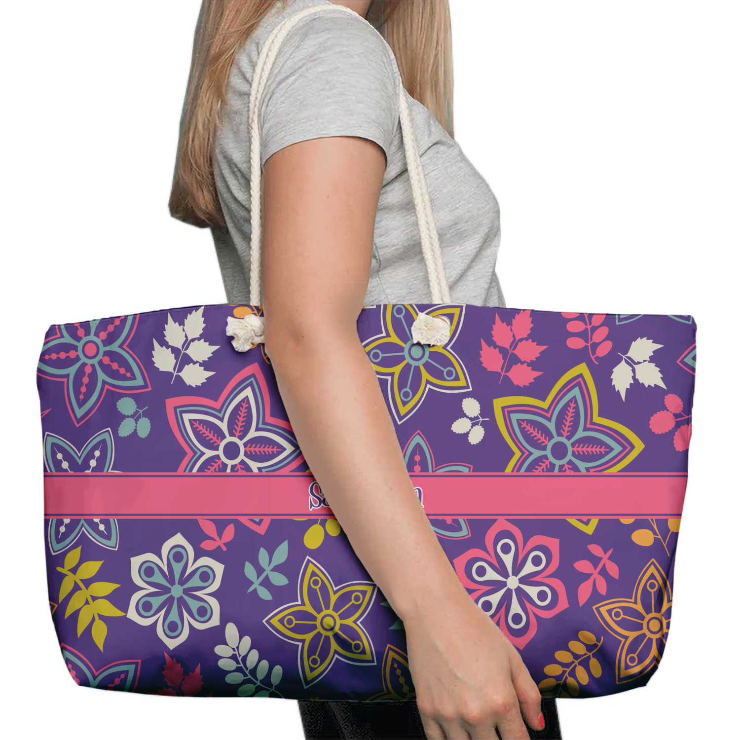 Our oversized weekender tote with rope handles is perfect for your weekend at the beach or on the town. This large tote are 24" W X 13" H, with a 5" gusset and a 27" thick rope handles with a knot that is put through a grommeted brass hole.