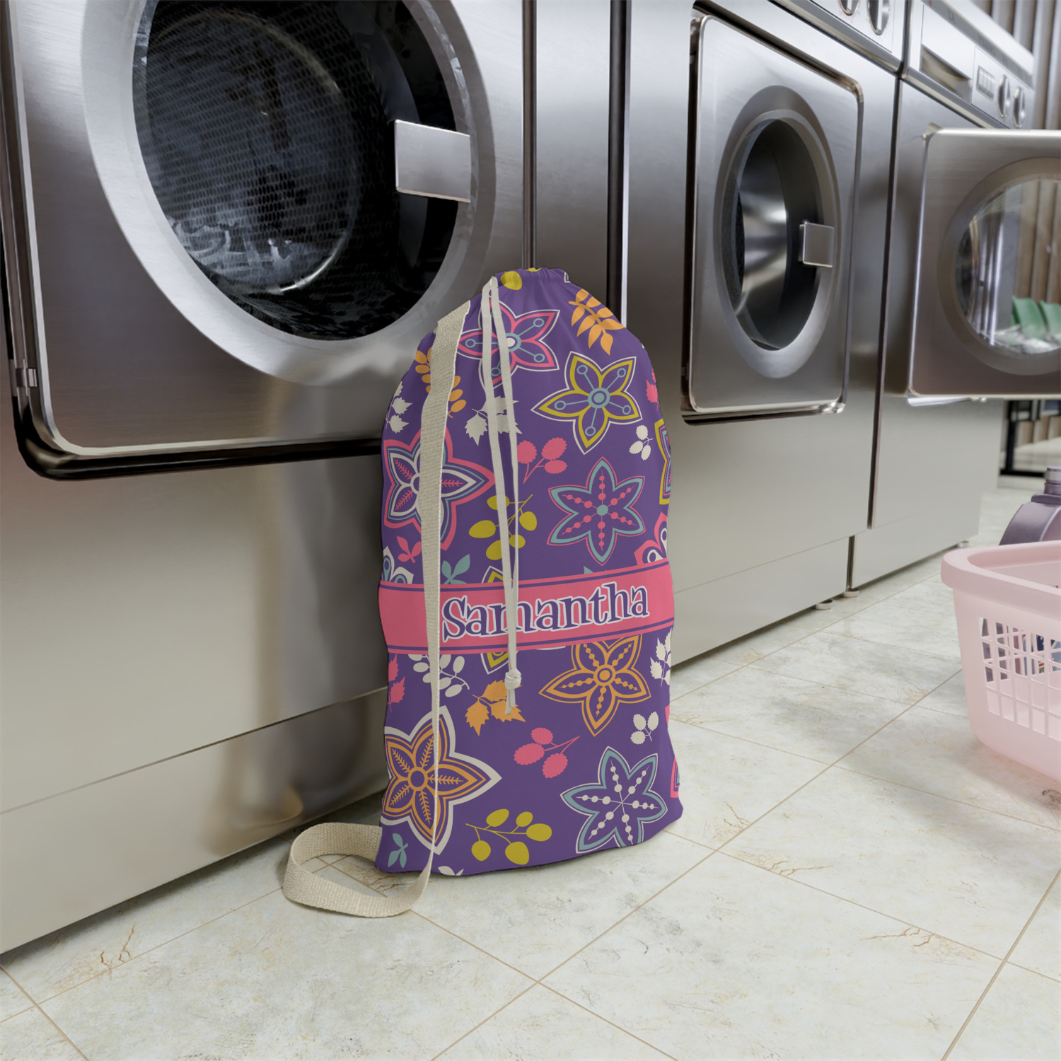 Carry your laundry in style with these customized laundry bags. Available in two sizes, featuring a natural colored woven strap and a cinch cord, these bags hold a lot of clothes or anything else you want to fit in them.