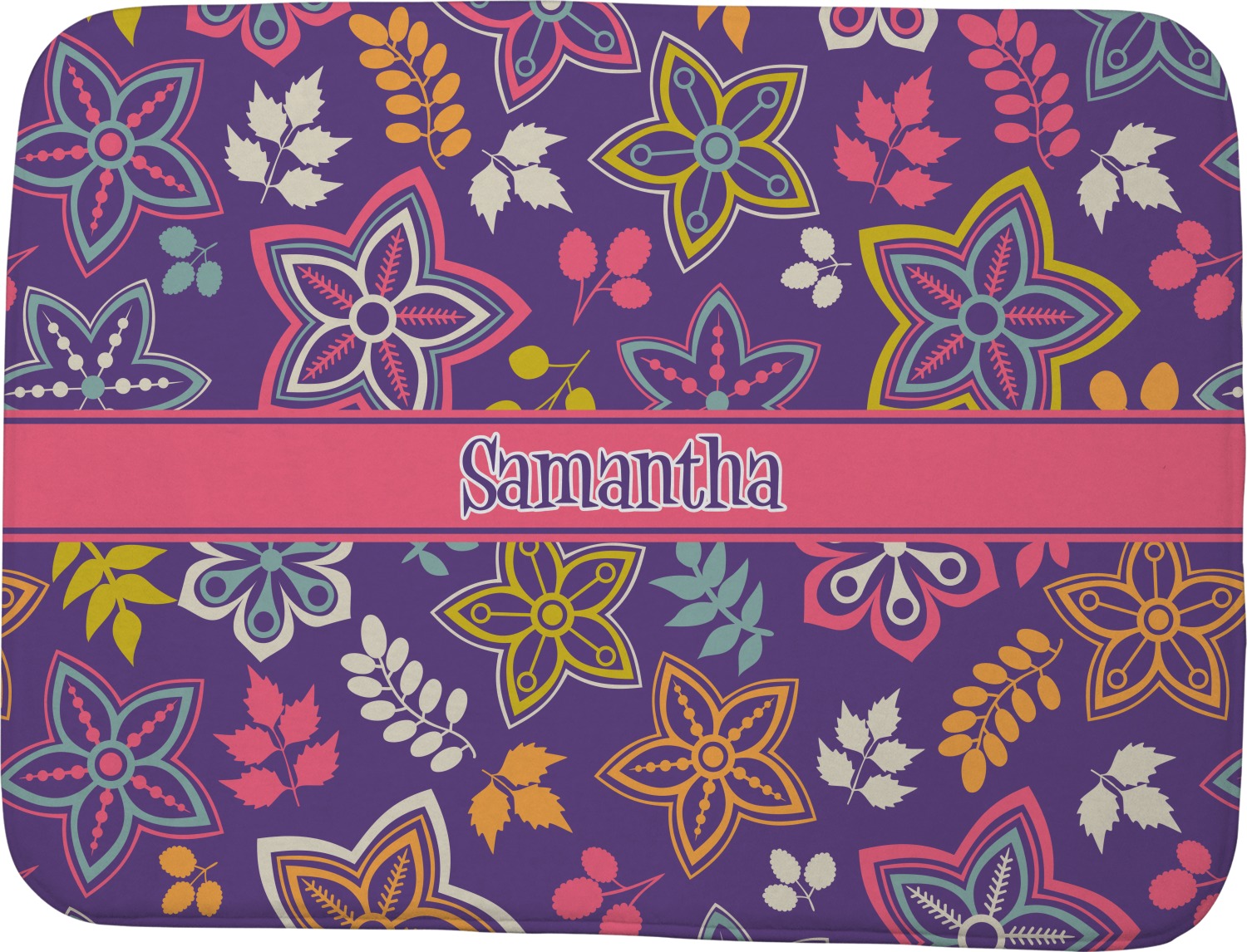 The flowers in this design are are a vibrant mix of fall colors, all on a deep plum background. The design has a classic ribbon in hot pink, the perfect place to add a name for that personal touch to pull the entire design together.