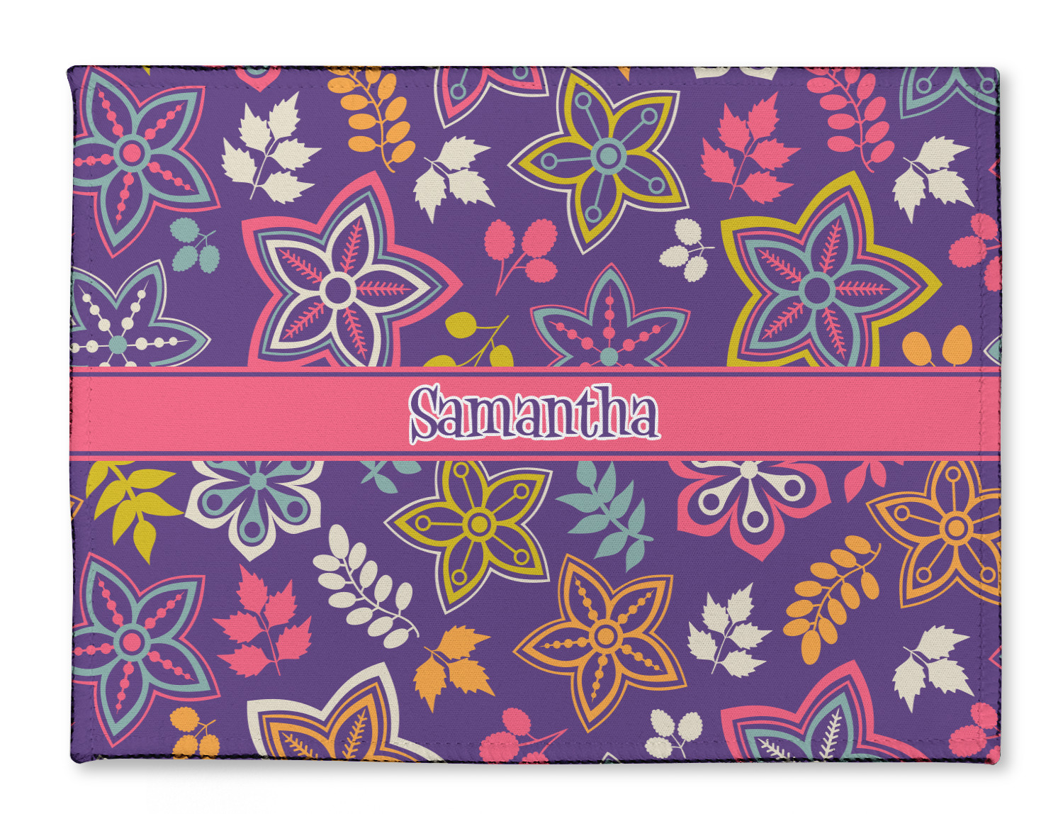 The flowers in this design are are a vibrant mix of fall colors, all on a deep plum background. The design has a classic ribbon in hot pink, the perfect place to add a name for that personal touch to pull the entire design together.