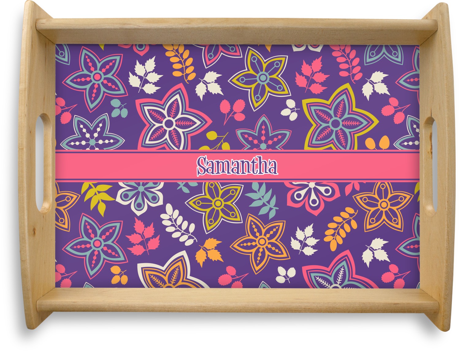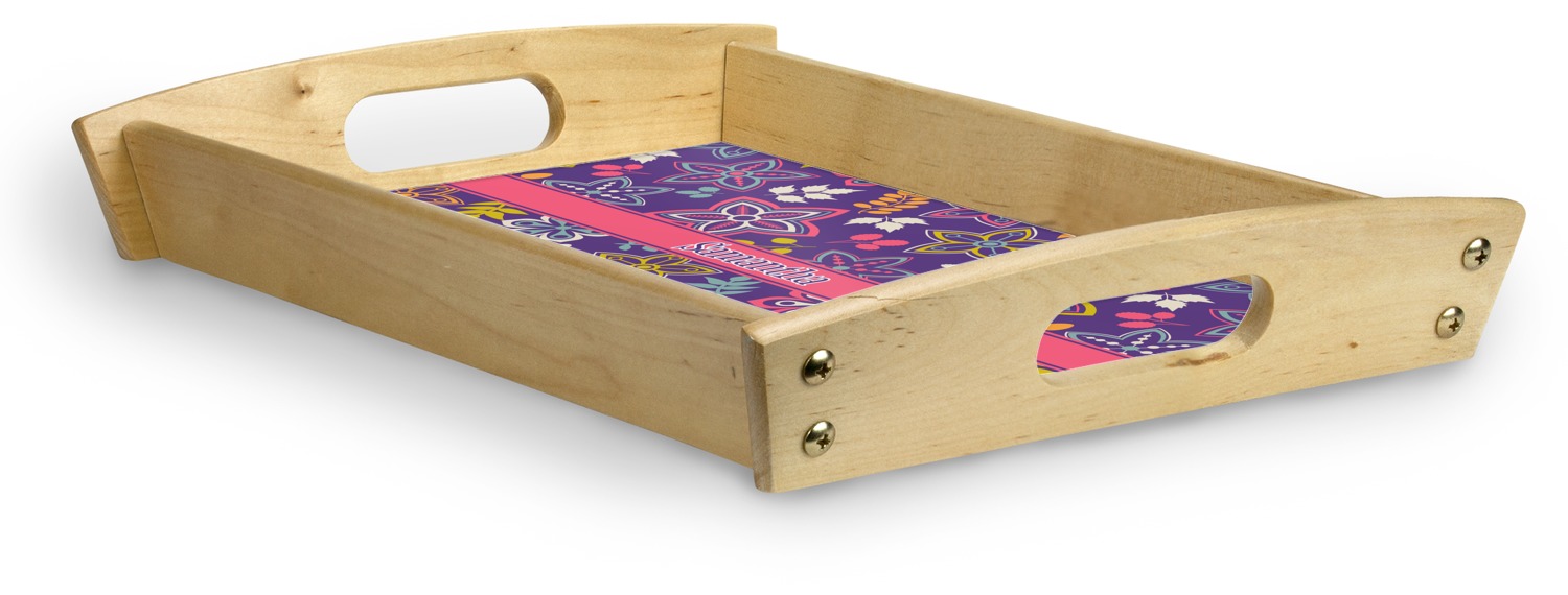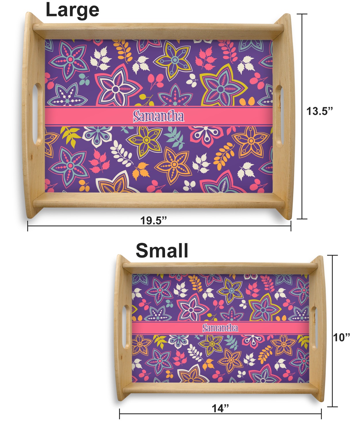 This serving tray with handles features square edges and two rounded sides, creating a very modern look. Each side is fabricated from a beautifully cut, natural wood. The bottom of the interior of the tray displays your customized design in bright, vibrant color. The tray is sold in both a black color and a natural wood look. Each variation of the wood serving tray has two sizes: Small, which is 14" x 10" x 2.25", and Large, which is 19.5" x 13.5" x 2.75".