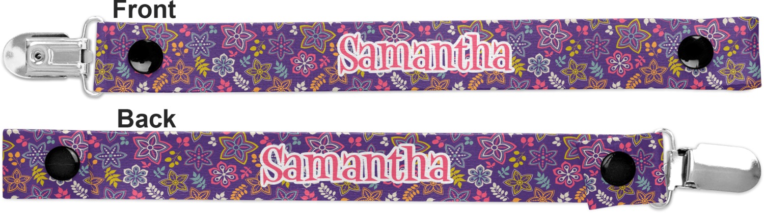 This personalized pacifier clip is the ideal size and measures at approximately 7.5 inches in length, when either end is snapped closed. On one end, you'll find a snap button. This button of your baby's pacifier holder is what can be attached to their pacifier to hold is securely in place. Simply open the snap, slip it through the pacifier opening, and snap it back into place. On the opposite end of this baby pacifier holder, you'll find a metal clip that can secure to a baby's collar or sleeve. This clip ensures that the strap stays in place, and that your baby's pacifier is always on hand.