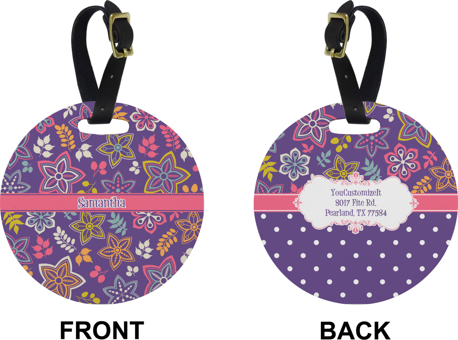 These personalized bag tags are sold in a variety of shapes, so that you may find the product that meets your vision exactly. We sell a round luggage tag, which measures at approximately 4" x 4". Our square luggage tag is about 3.5" x 3.5", while our rectangular version is 2.75" x 4 ".