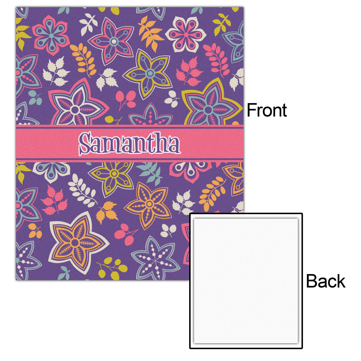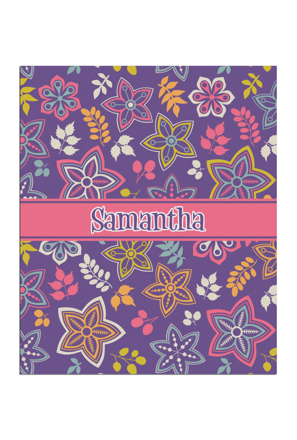 The flowers in this design are are a vibrant mix of fall colors, all on a deep plum background. The design has a classic ribbon in hot pink, the perfect place to add a name for that personal touch to pull the entire design together.