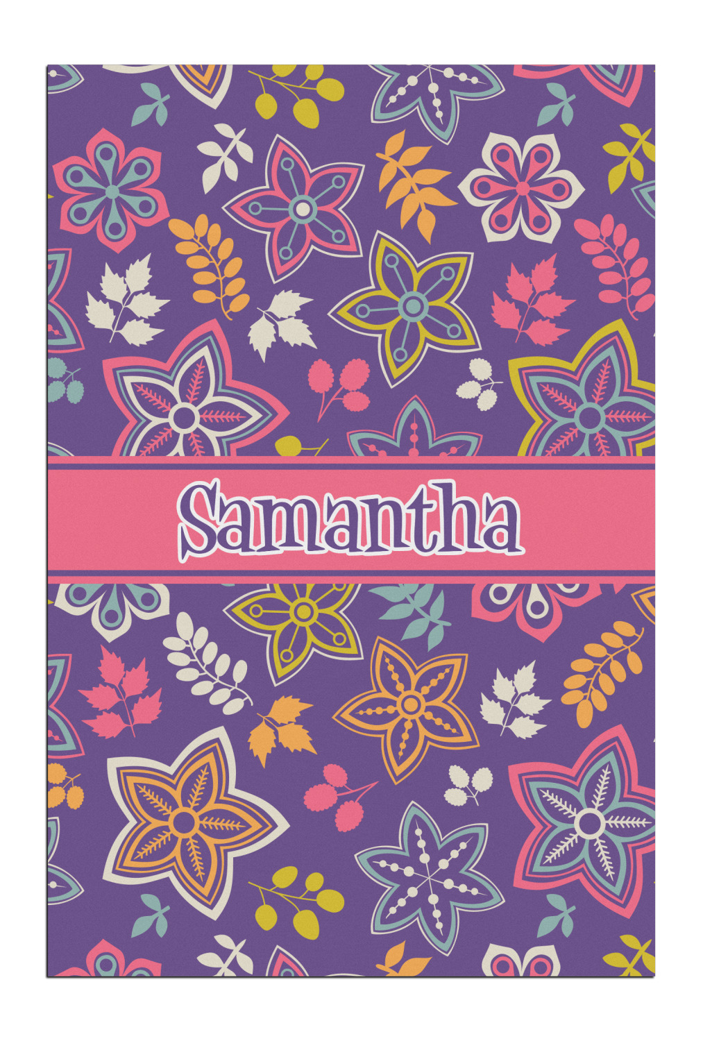 The flowers in this design are are a vibrant mix of fall colors, all on a deep plum background. The design has a classic ribbon in hot pink, the perfect place to add a name for that personal touch to pull the entire design together.
