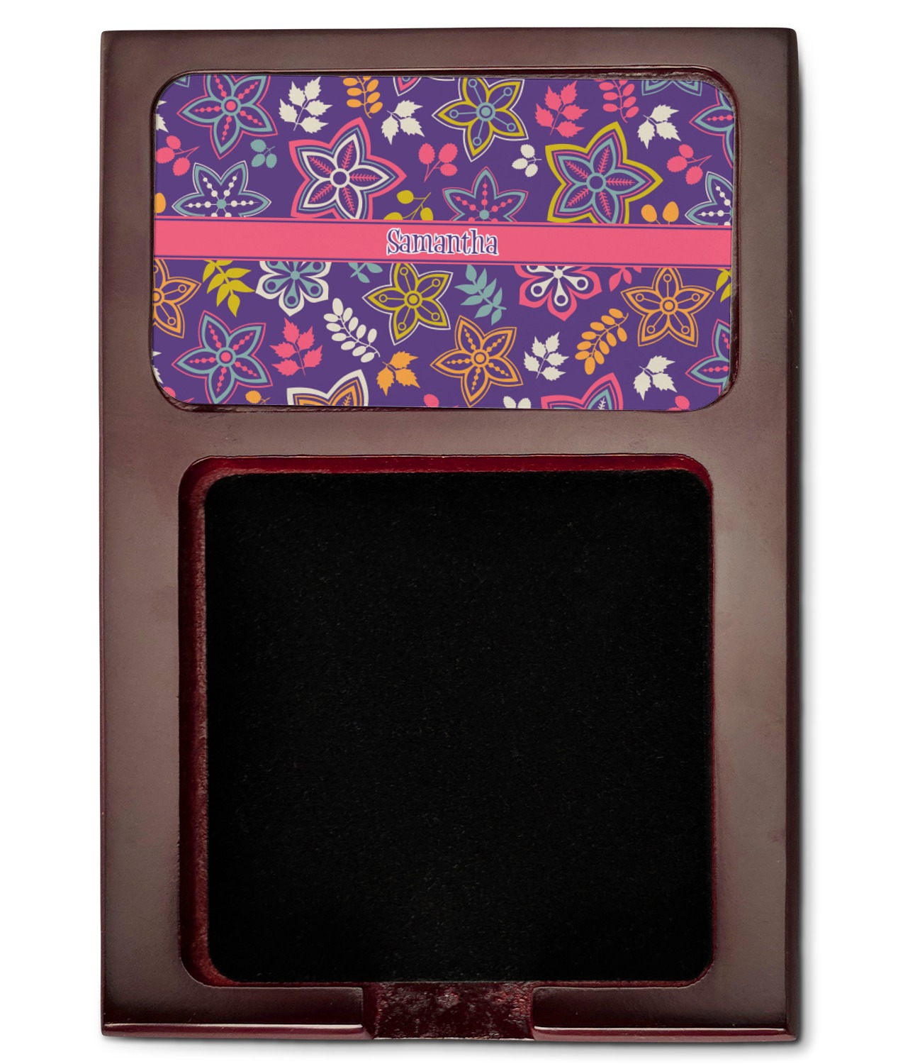 Crafted from a fine mahogany, this post it note holder is in the shade of a dark, cherry color. The dispenser itself is about 4.25 by 6.25 by 0.75 inches. You can place your 3 by 3 inch sticky notes in the indentation below the nameplate. We print your customization onto the nameplate that rests above the velvety indentation.