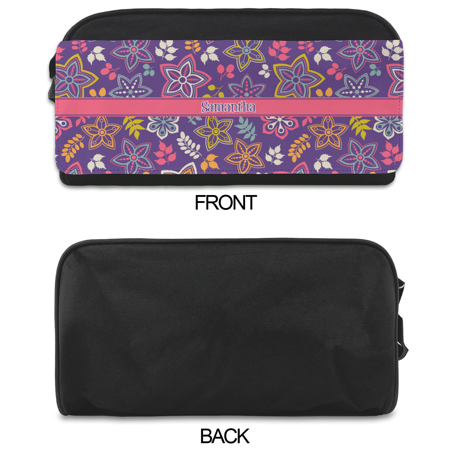 The flowers in this design are are a vibrant mix of fall colors, all on a deep plum background. The design has a classic ribbon in hot pink, the perfect place to add a name for that personal touch to pull the entire design together.
