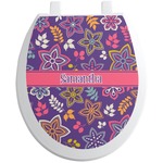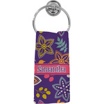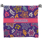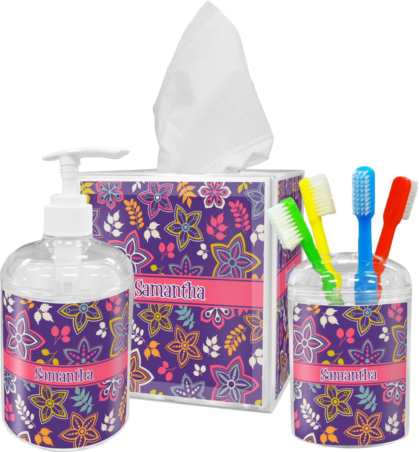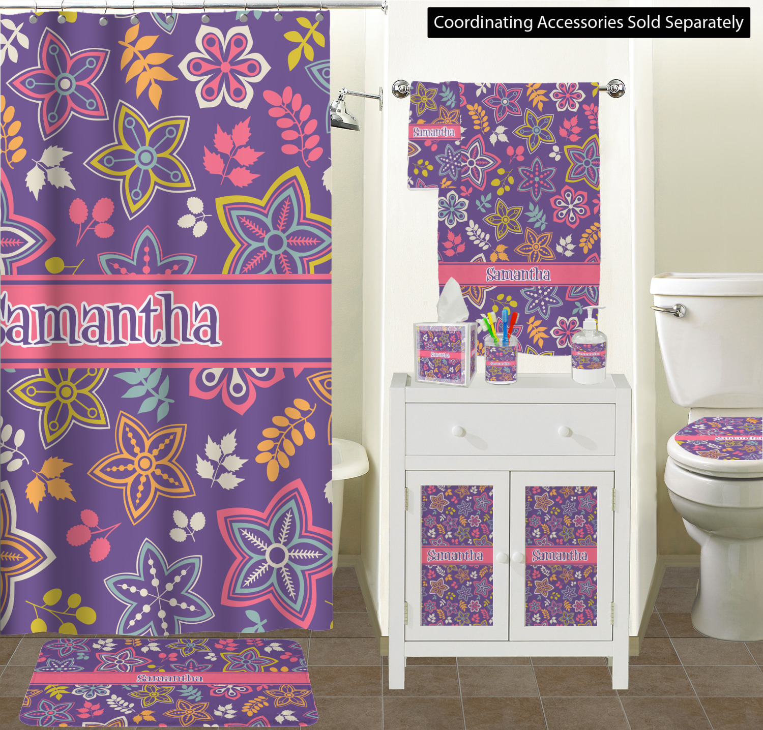 The flowers in this design are are a vibrant mix of fall colors, all on a deep plum background. The design has a classic ribbon in hot pink, the perfect place to add a name for that personal touch to pull the entire design together.