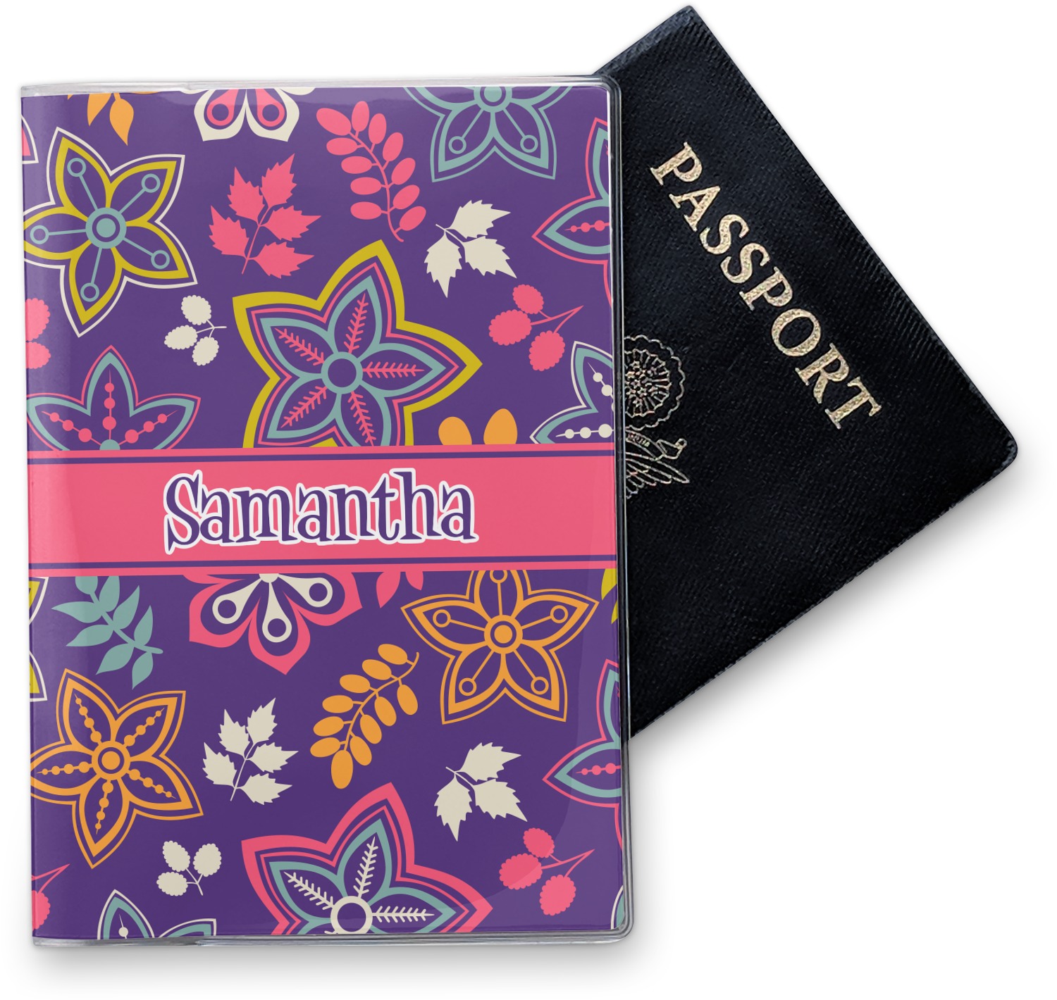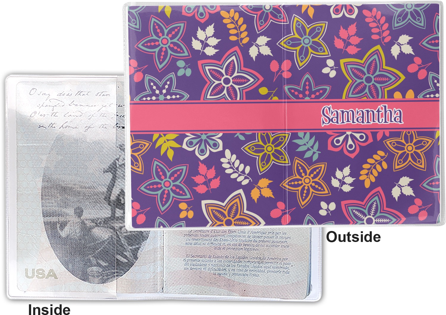 This cover is made of a sturdy clear vinyl with a personalized vinyl insert inside. There is a large and a small pocket on either side to hold the covers of your passport easily and firmly. The passport holder is approximately 7.5" x 5.25", the perfect size to snugly fit your passport. This slim cover is the perfect way to protect your passport without being one more bulky item you have to carry.