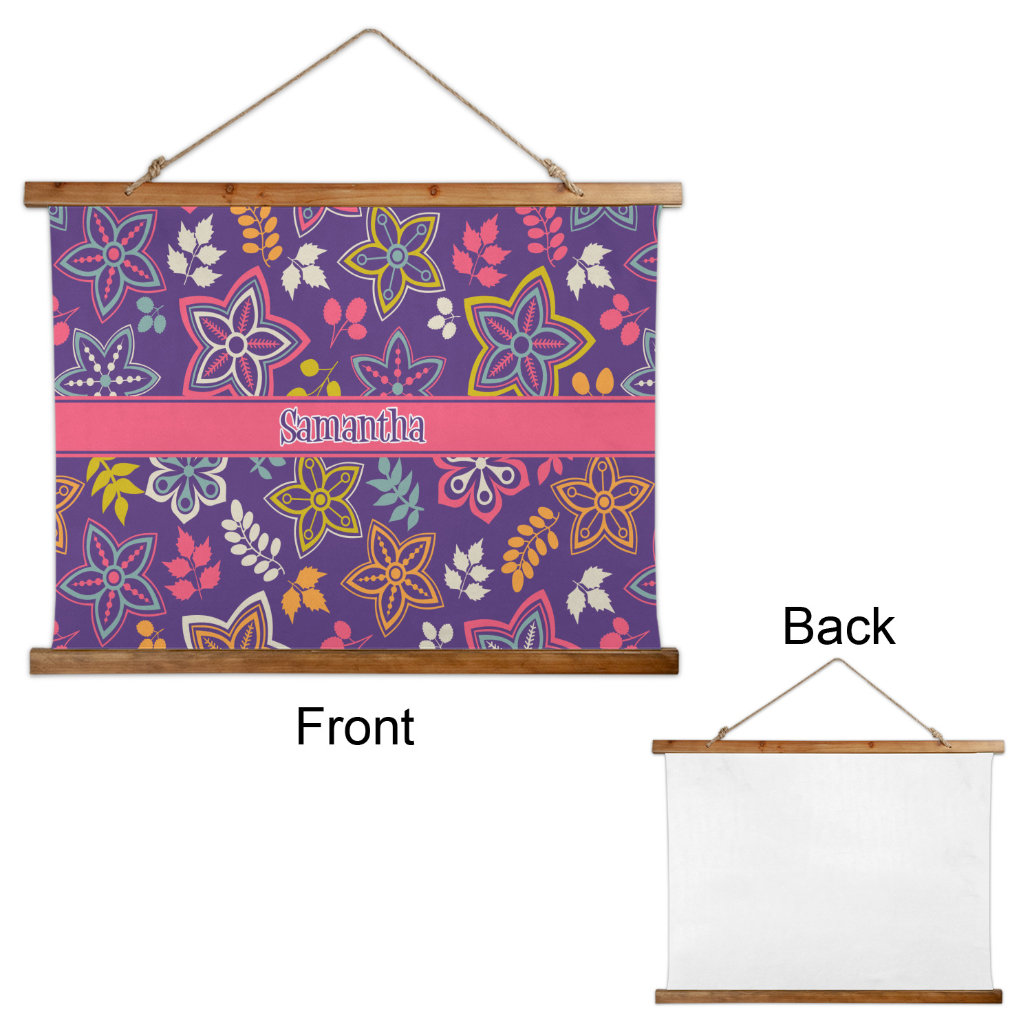 Made in two different orientations - portrait or landscape - both are 26" x 36". Your design is printed on a high quality polyester fabric with hemmed edges. The wood on the top and bottom of the tapestry is 1.25" tall and 0.25" thick and there are two pieces on top and bottom which sandwich the fabric.