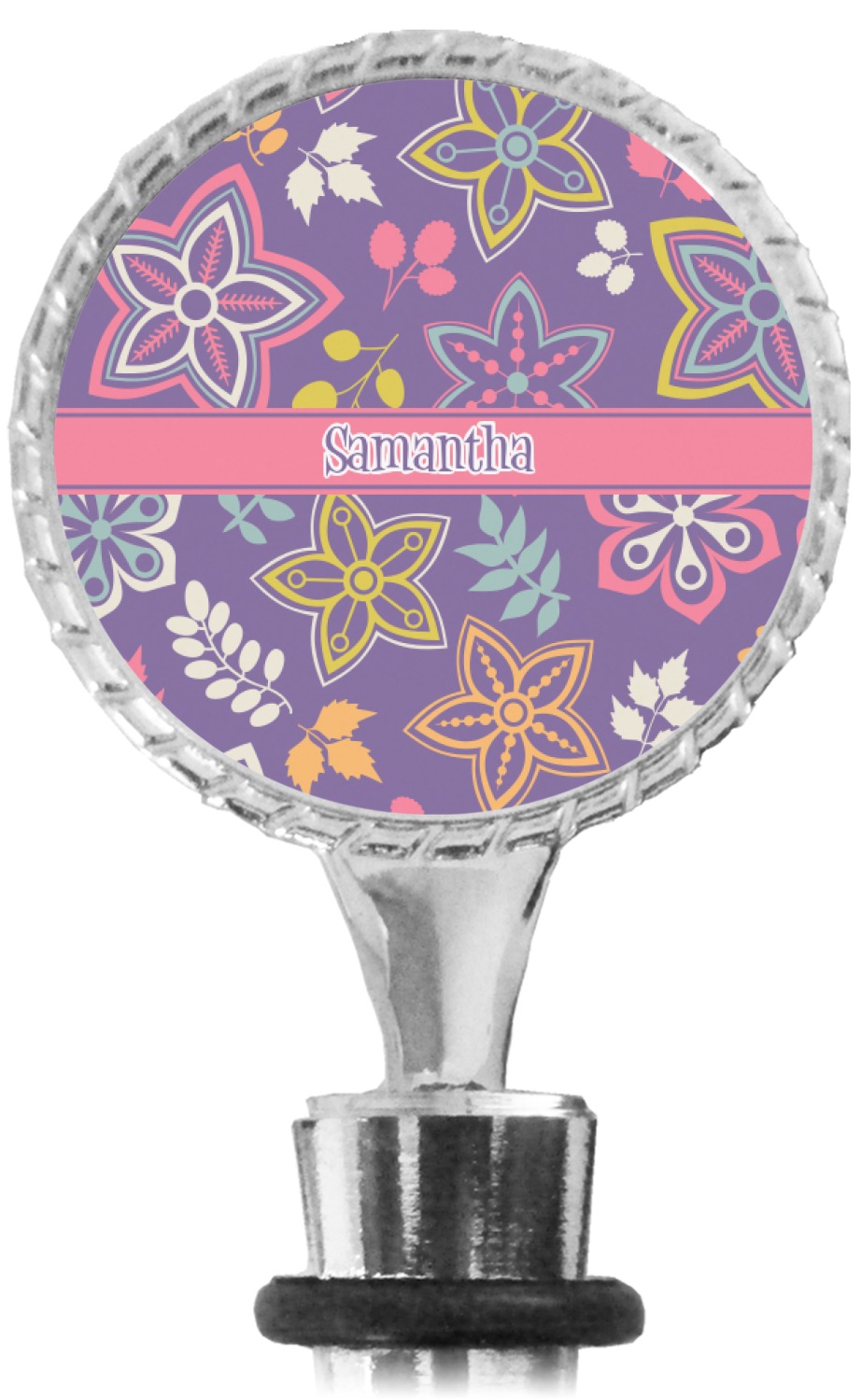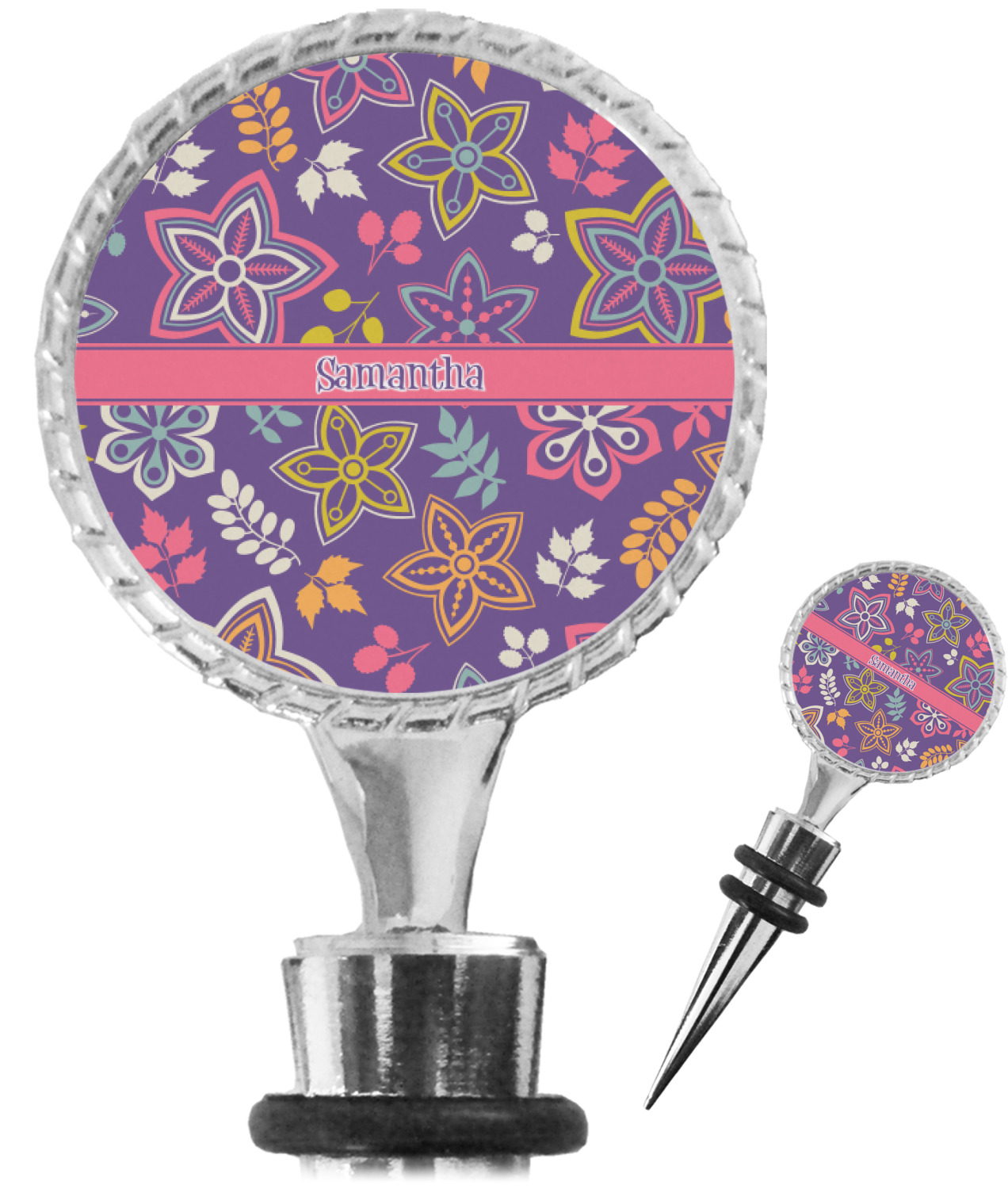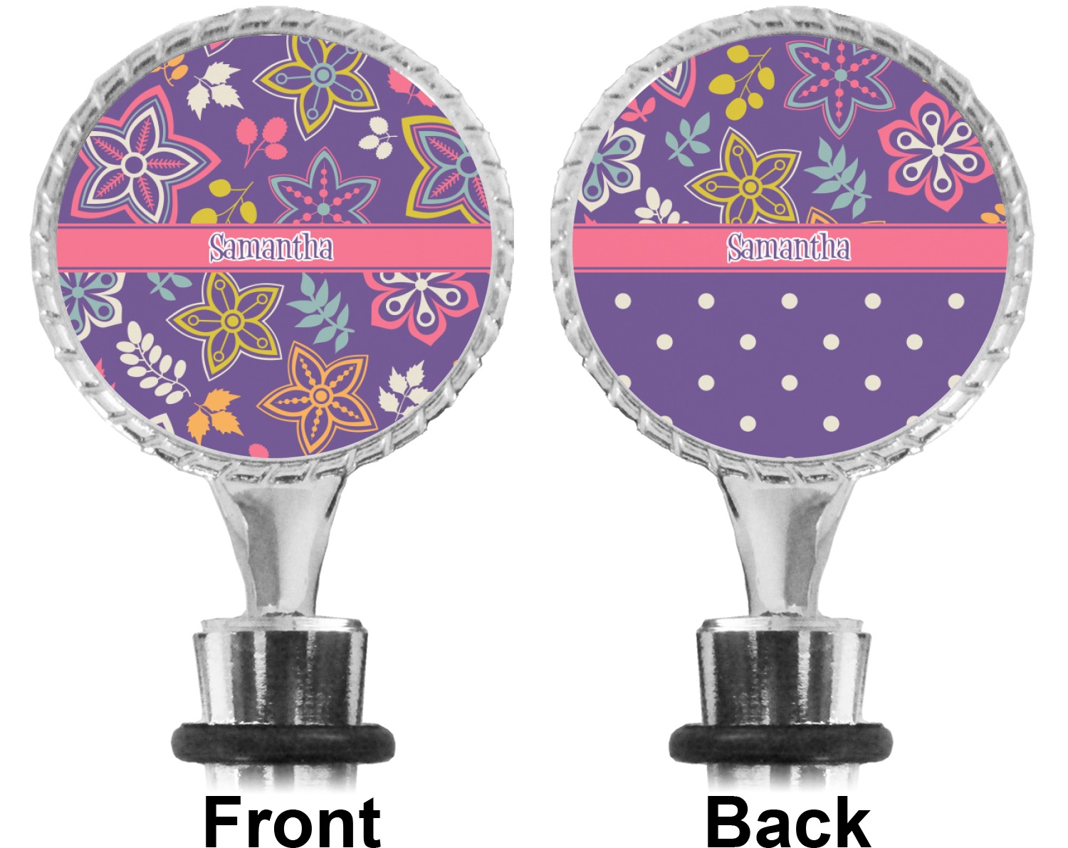 The top part of your bottle stopper is comprised of a zinc ring that displays your customization(s) in its middle, on both sides. The ring is heavy duty, with a bright chrome finish. The body of the wine stoppers have two silicone rings to provide an airtight seal. These wine bottle stoppers measure at 1.625" L x 0.8125" W x 4.625" H; your custom wine stopper is meant to fit into most standard-sized wine bottles.