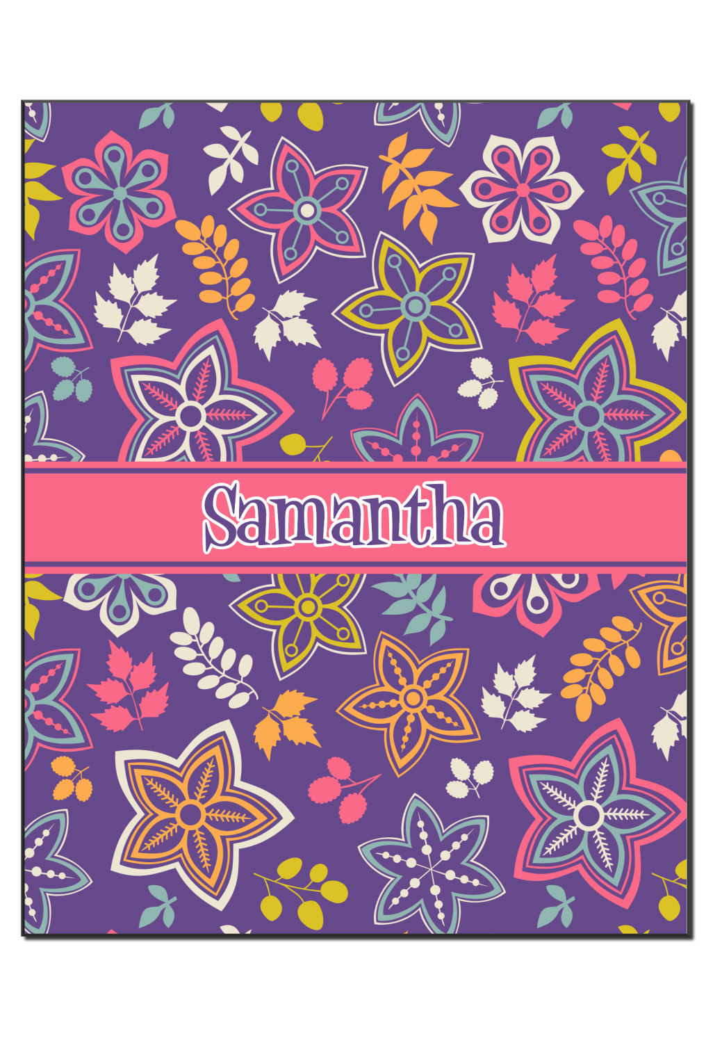 The flowers in this design are are a vibrant mix of fall colors, all on a deep plum background. The design has a classic ribbon in hot pink, the perfect place to add a name for that personal touch to pull the entire design together.