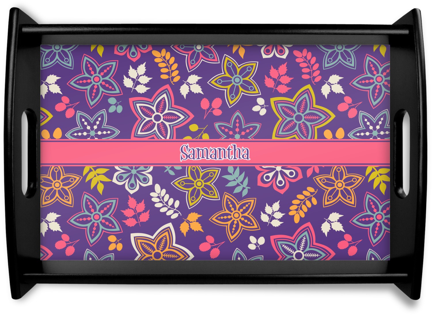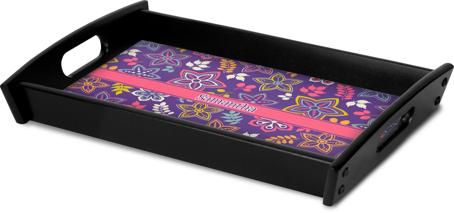 This serving tray with handles features square edges and two rounded sides, creating a very modern look. Each side is fabricated from a beautifully cut, natural wood. The bottom of the interior of the tray displays your customized design in bright, vibrant color. The tray is sold in both a black color and a natural wood look. Each variation of the wood serving tray has two sizes: Small, which is 14" x 10" x 2.25", and Large, which is 19.5" x 13.5" x 2.75".