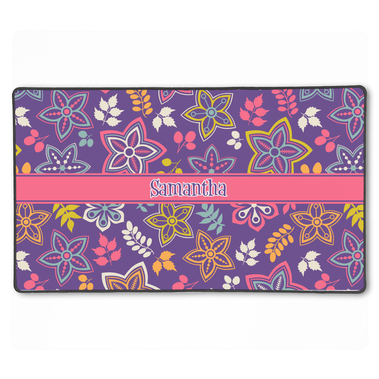 The flowers in this design are are a vibrant mix of fall colors, all on a deep plum background. The design has a classic ribbon in hot pink, the perfect place to add a name for that personal touch to pull the entire design together.