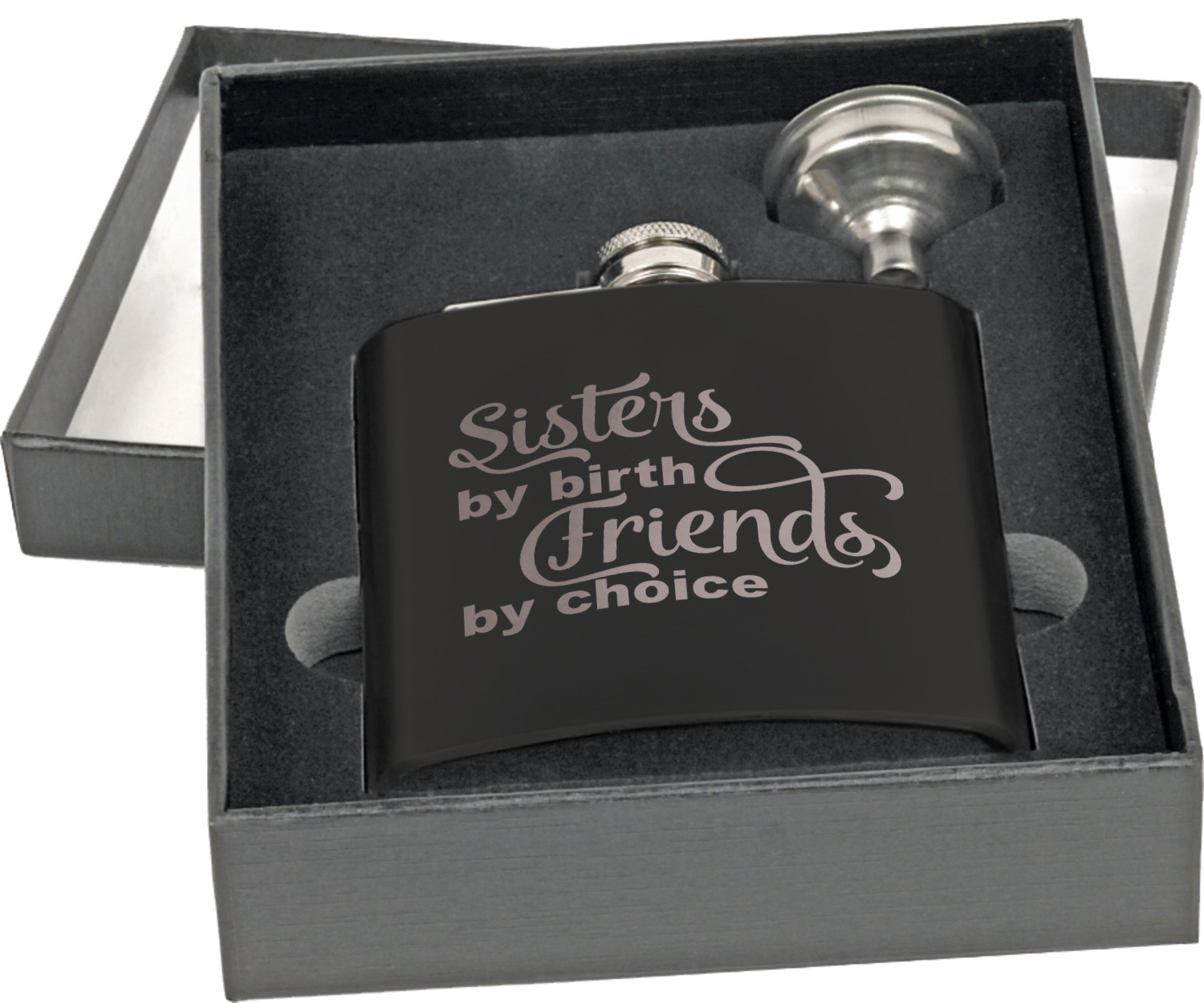 Built from a stainless steel and then covered with a black coating, this hip flask, has a very classy appearance. Similar to the standard flask, this stainless steel flask has the traditional curved shape for a snug fit in your palm. This flask set also includes a traditional screw and flip lid and liquid funnel in a gift box. At 4 by 4.5 inches, this flask can hold up to 6 ounces. Your personalized design is laser-engraved across the front of this flask.