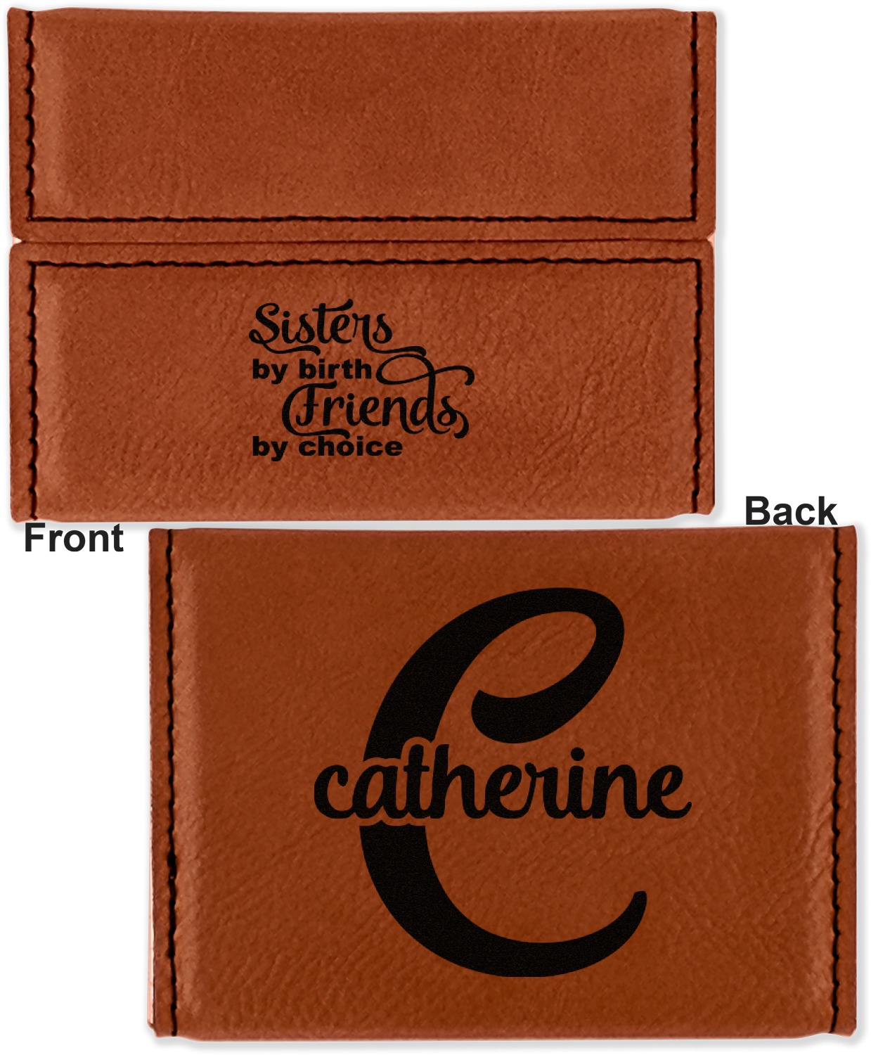 Your personalized design is laser engraved onto either the front, or the front and back of the card holder, depending on the model you purchase. Once engraved, the design will appear a darkened black against the cognac color of the leatherette.