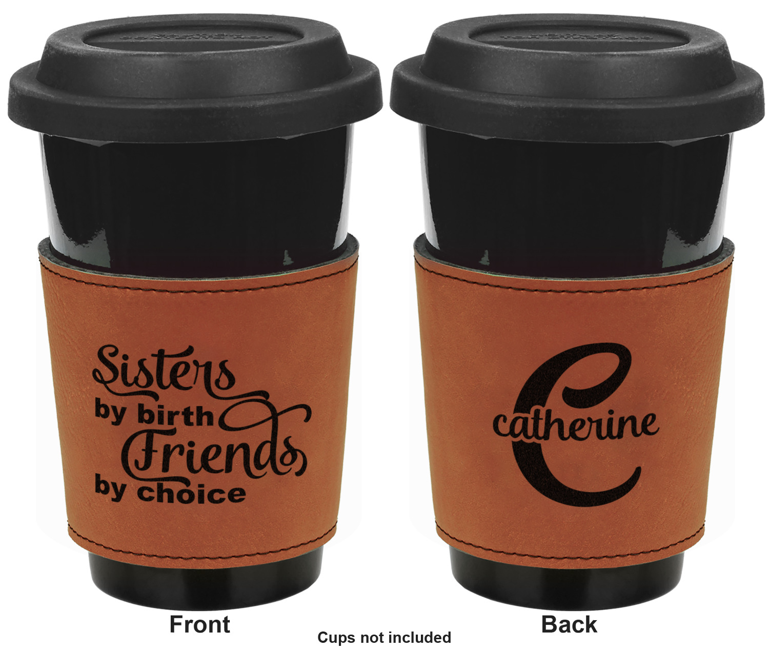 This cup sleeve is made from a suave, cognac-brown leatherette and finished with an intricate, black stitch. The interior of this can sleeve is fabricated from a thin foam material to help insulate your mug's contents. The sleeve is specifically made to suit tapered glasses or mugs, so the top's diameter is 3.5 inches, while the bottom's diameter is 2.75 inches. Your customized design will be laser engraved into the leatherette, leaving behind crisp, black imprint. With these products, we provide you with the option of engraving the front and back, or the front only.