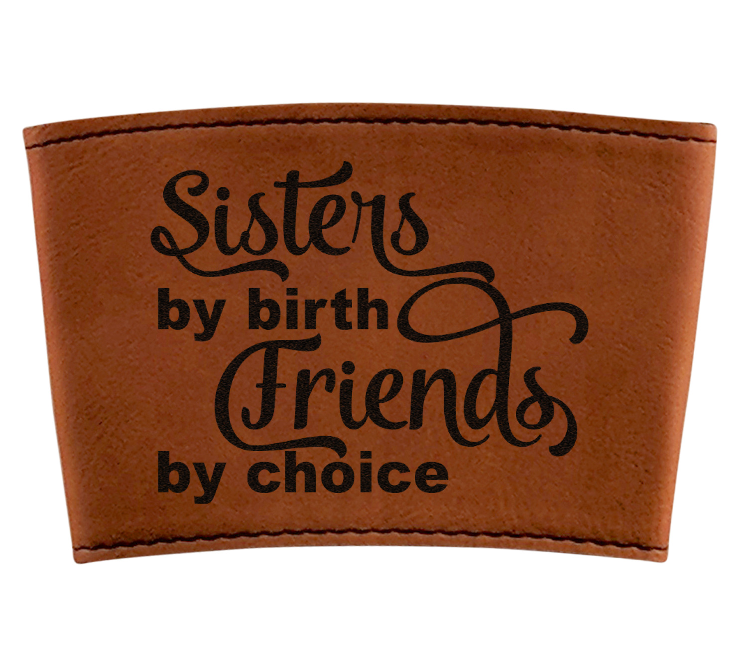 This cup sleeve is made from a suave, cognac-brown leatherette and finished with an intricate, black stitch. The interior of this can sleeve is fabricated from a thin foam material to help insulate your mug's contents. The sleeve is specifically made to suit tapered glasses or mugs, so the top's diameter is 3.5 inches, while the bottom's diameter is 2.75 inches. Your customized design will be laser engraved into the leatherette, leaving behind crisp, black imprint. With these products, we provide you with the option of engraving the front and back, or the front only.