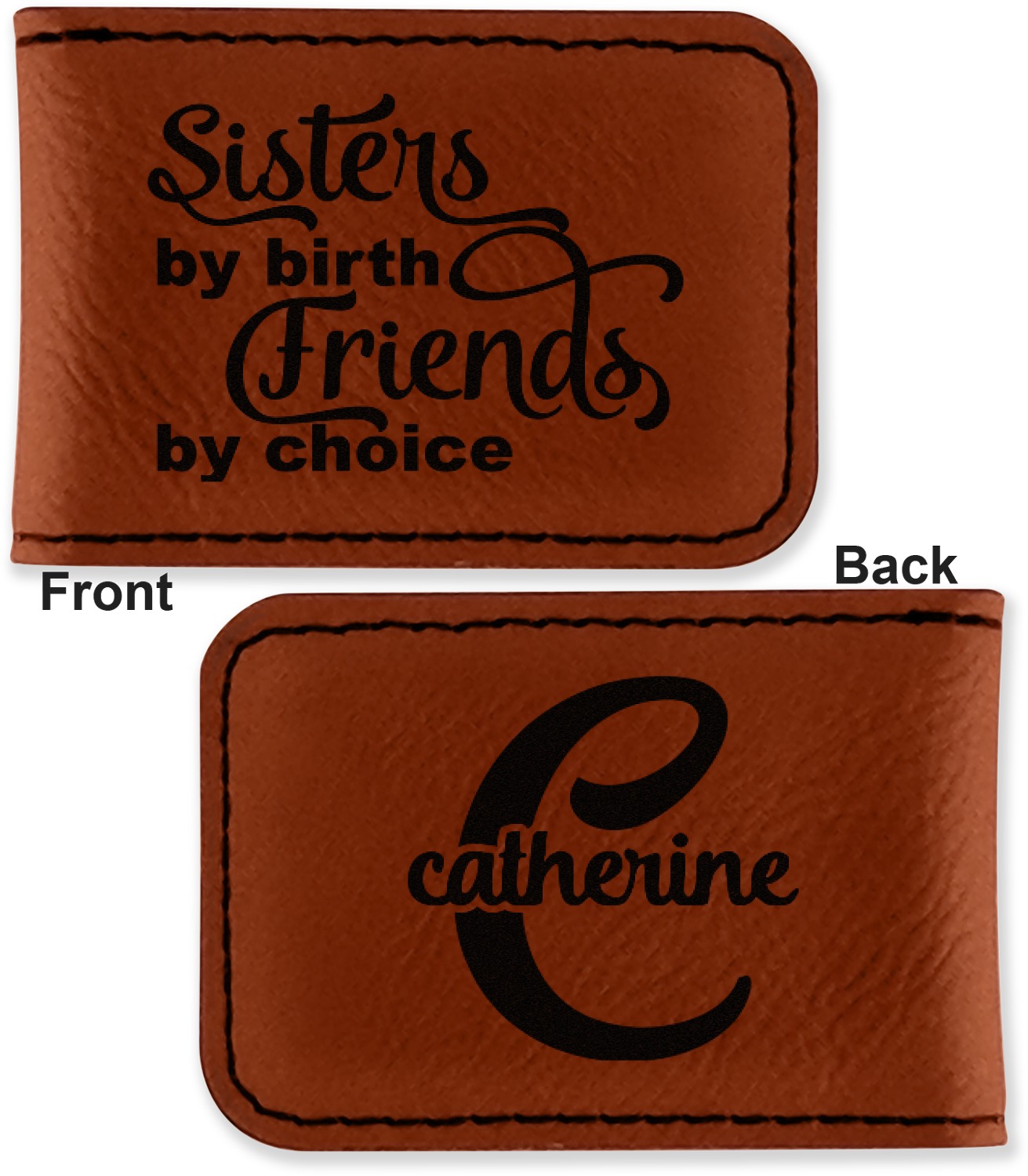 Your money clip will be laser engraved so that the design you choose will come out black. Find a fun graphic, monogram, or font to use to personalize your money clip either on just the front or the front and the back.