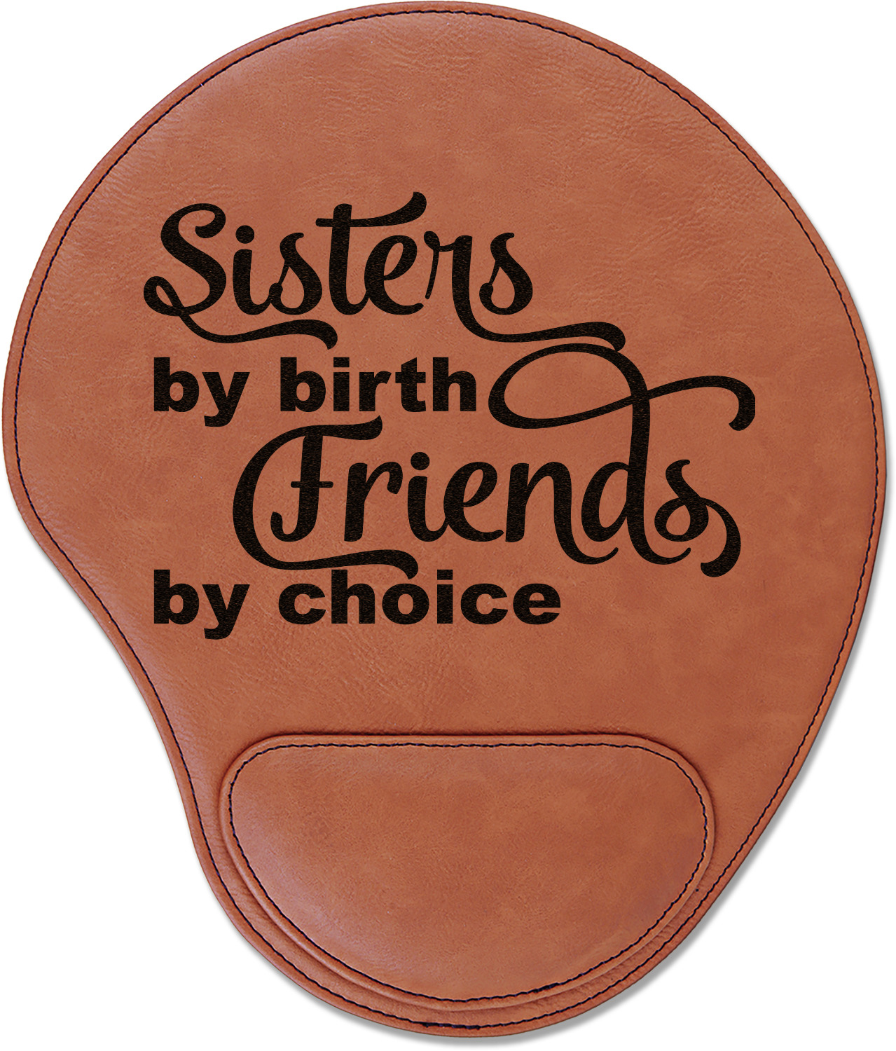 In a rounded shape, this mouse pad is made of a luxurious, cognac-colored leatherette. The nature of this material allows your mouse to glide smoothly across its surface. Strong stitching lines the edges to guarantee stability and strength. As added support for tired wrists, your personalized mouse pad features a supportive wrist rest at its bottom. This model measures at 10.25" x 9", while its wrist pad is approximately 5" x 2.75", with a thickness of 0.75". Your personalized design is laser engraved into the front face of this mouse pad.