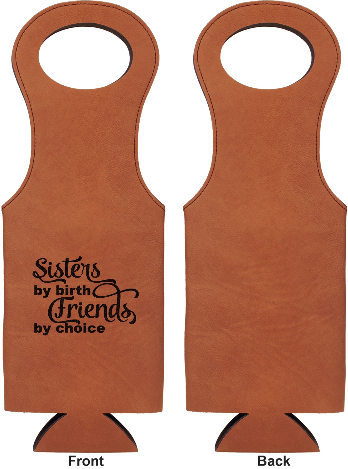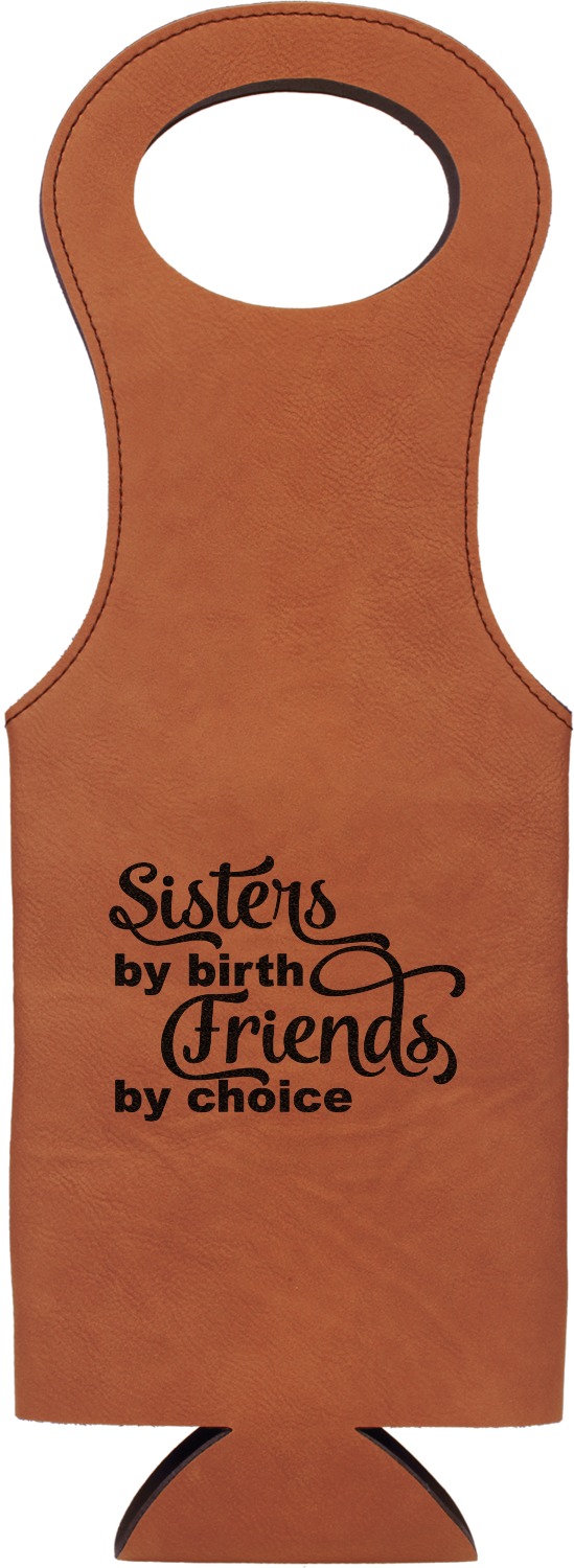 This wine carrier is made from a stunning leatherette, in a cognac-brown color. Strong, black stitching lines the sides of your wine bottle bag and provides extra durability. The interior is lined with a padded, black material to allow for a snug fit once your bottle is placed inside. At the top of this wine gift bag, you'll find two oval shaped handles that elegantly complements the rest of the bag's style. We provide you with the option of laser-engraving the front, or the front and back of your new personalized wine bag!
