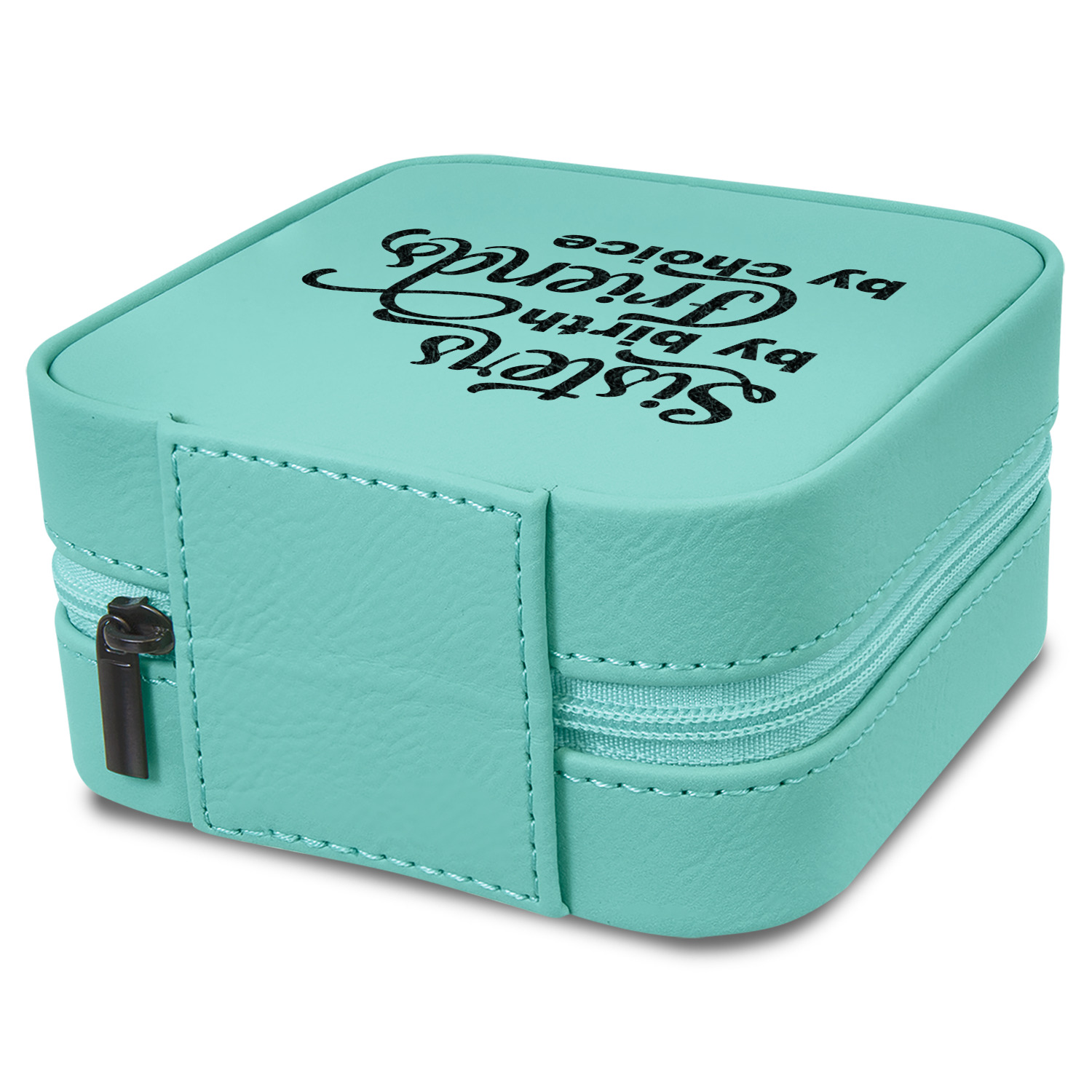 This square zippered travel jewelry box is made from leatherette and is available in four colors - classic cognac / rawhide, a beautiful teal. navy blue or pink. The tan colored soft velvet inside has compartments and hooks for all your jewelry - rings, chains, earrings, bangles etc.