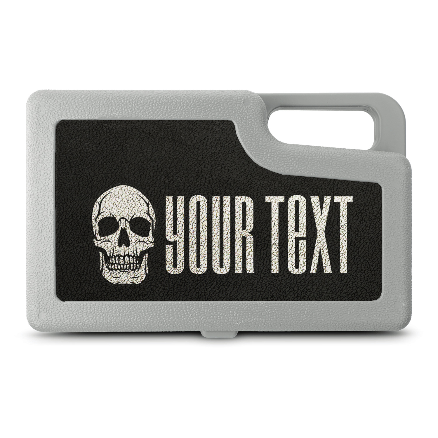 This design has a cool background with skulls facing every which way. They are all grey and black. You are able to personalize you design with the text that is placed at the bottom of the design. This really is the perfect design for your hardcore man!