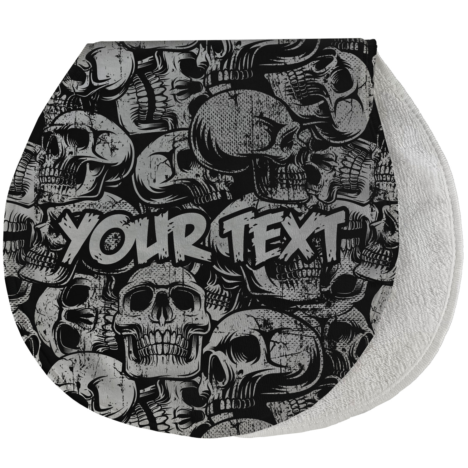 This design has a cool background with skulls facing every which way. They are all grey and black. You are able to personalize you design with the text that is placed at the bottom of the design. This really is the perfect design for your hardcore man!