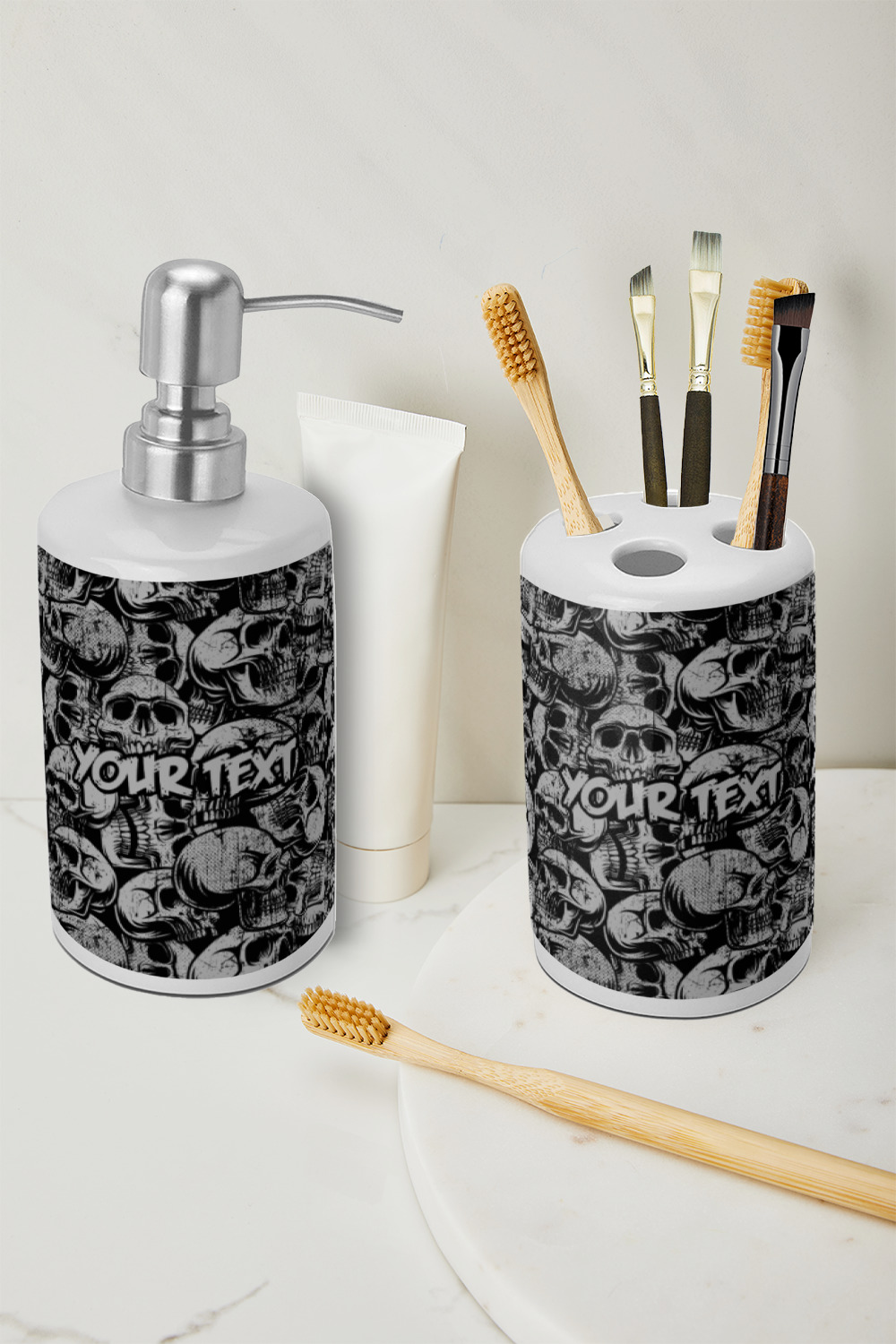 Both pieces of the set are made of white ceramic with a glossy finish. The dispenser has a brushed stainless nozzle and plastic pumping mechanism. The top easily screws off and on to refill. The toothbrush holder is one solid piece with four holes on top and one hole on the base. The top four holes measure 3/4 inch in diameter, and the hole at the base is 1 inch in diameter. The design does NOT wrap all the way around. There is about a one inch white stripe on the back of both items.